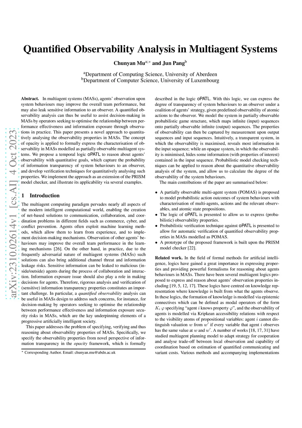 In multiagent systems (MASs), agents' observation upon system behaviours may improve the overall team performance, but may also leak sensitive information to an observer. A quantified observability analysis can thus be useful to assist decision-making in MASs by operators seeking to optimise the relationship between performance effectiveness and information exposure through observations in practice. This paper presents a novel approach to quantitatively analysing the observability properties in MASs. The concept of opacity is applied to formally express the characterisation of observability in MASs modelled as partially observable multiagent systems. We propose a temporal logic oPATL to reason about agents' observability with quantitative goals, which capture the probability of information transparency of system behaviours to an observer, and develop verification techniques for quantitatively analysing such properties. We implement the approach as an extension of the PRISM model checker, and illustrate its applicability via several examples.