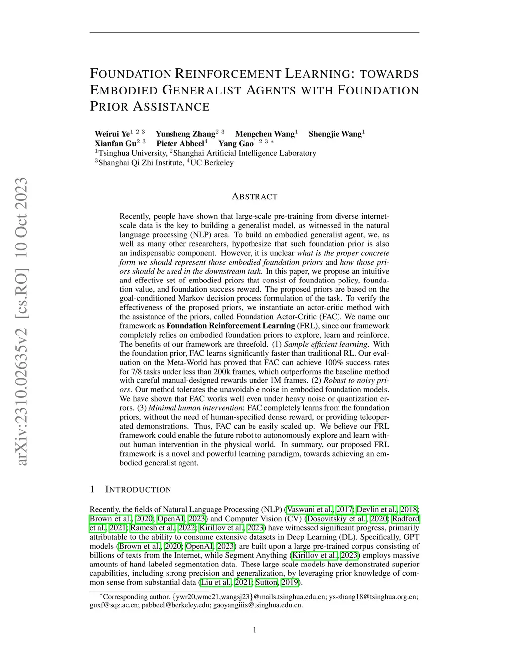 Recently, people have shown that large-scale pre-training from internet-scale data is the key to building generalist models, as witnessed in NLP. To build embodied generalist agents, we and many other researchers hypothesize that such foundation prior is also an indispensable component. However, it is unclear what is the proper concrete form to represent those embodied foundation priors and how they should be used in the downstream task. In this paper, we propose an intuitive and effective set of embodied priors that consist of foundation policy, value, and success reward. The proposed priors are based on the goal-conditioned MDP. To verify their effectiveness, we instantiate an actor-critic method assisted by the priors, called Foundation Actor-Critic (FAC). We name our framework as Foundation Reinforcement Learning (FRL), since it completely relies on embodied foundation priors to explore, learn and reinforce. The benefits of FRL are threefold. (1) Sample efficient. With foundation priors, FAC learns significantly faster than traditional RL. Our evaluation on the Meta-World has proved that FAC can achieve 100% success rates for 7/8 tasks under less than 200k frames, which outperforms the baseline method with careful manual-designed rewards under 1M frames. (2) Robust to noisy priors. Our method tolerates the unavoidable noise in embodied foundation models. We show that FAC works well even under heavy noise or quantization errors. (3) Minimal human intervention: FAC completely learns from the foundation priors, without the need of human-specified dense reward, or providing teleoperated demos. Thus, FAC can be easily scaled up. We believe our FRL framework could enable the future robot to autonomously explore and learn without human intervention in the physical world. In summary, our proposed FRL is a novel and powerful learning paradigm, towards achieving embodied generalist agents.