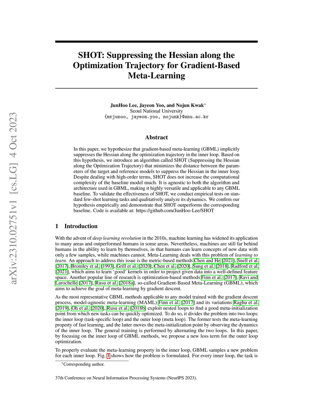 In this paper, we hypothesize that gradient-based meta-learning (GBML) implicitly suppresses the Hessian along the optimization trajectory in the inner loop. Based on this hypothesis, we introduce an algorithm called SHOT (Suppressing the Hessian along the Optimization Trajectory) that minimizes the distance between the parameters of the target and reference models to suppress the Hessian in the inner loop. Despite dealing with high-order terms, SHOT does not increase the computational complexity of the baseline model much. It is agnostic to both the algorithm and architecture used in GBML, making it highly versatile and applicable to any GBML baseline. To validate the effectiveness of SHOT, we conduct empirical tests on standard few-shot learning tasks and qualitatively analyze its dynamics. We confirm our hypothesis empirically and demonstrate that SHOT outperforms the corresponding baseline. Code is available at: https://github.com/JunHoo-Lee/SHOT