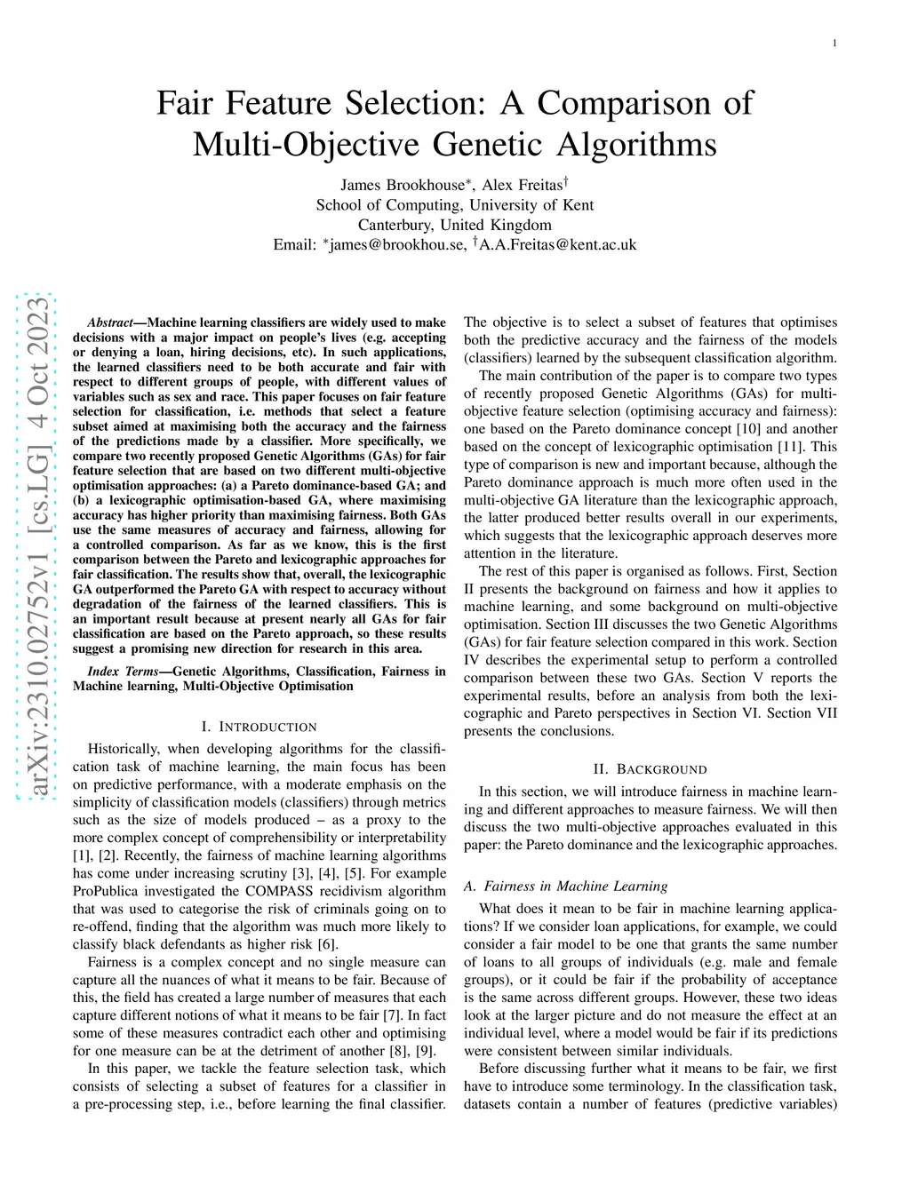 Fair Feature Selection: A Comparison of Multi-Objective Genetic