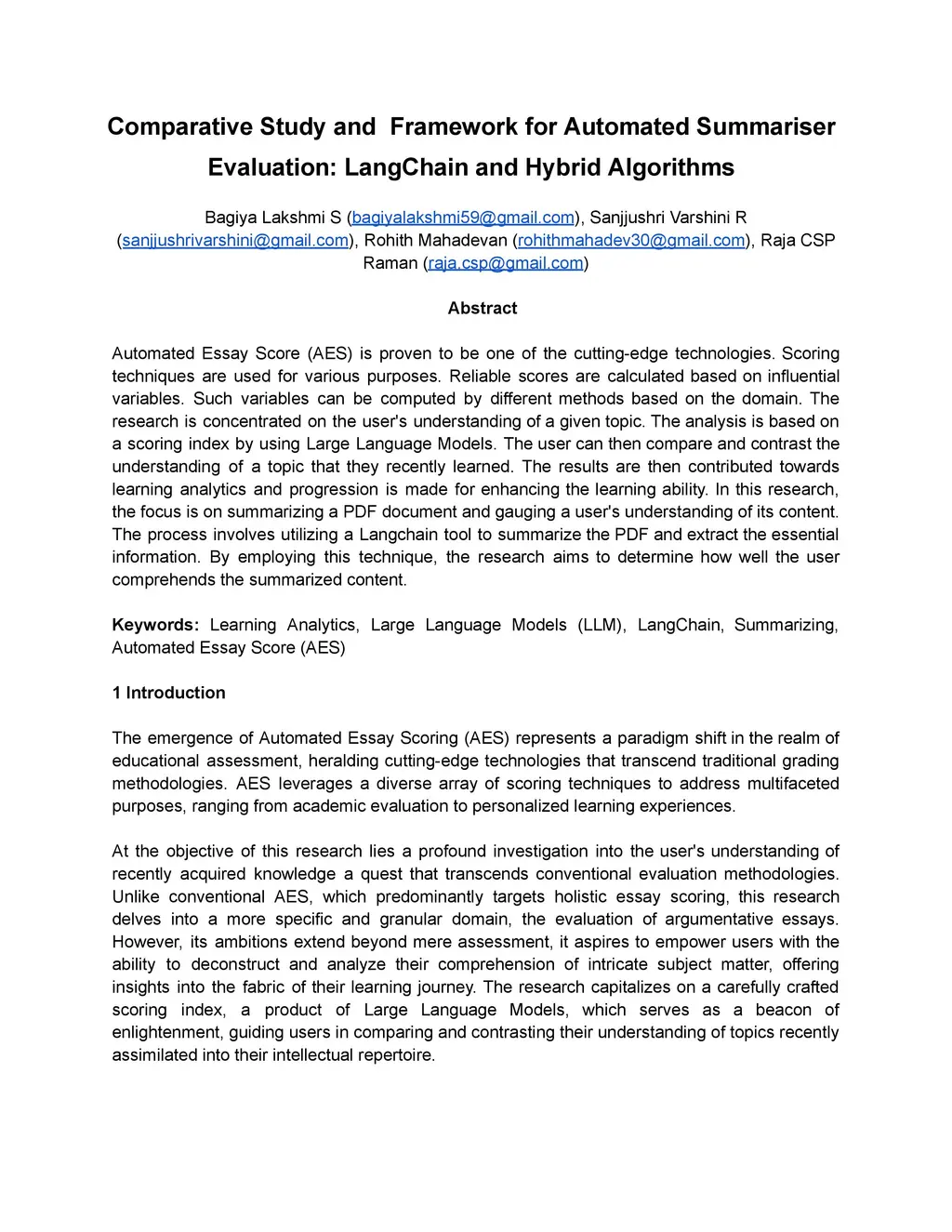 Automated Essay Score (AES) is proven to be one of the cutting-edge technologies. Scoring techniques are used for various purposes. Reliable scores are calculated based on influential variables. Such variables can be computed by different methods based on the domain. The research is concentrated on the user's understanding of a given topic. The analysis is based on a scoring index by using Large Language Models. The user can then compare and contrast the understanding of a topic that they recently learned. The results are then contributed towards learning analytics and progression is made for enhancing the learning ability. In this research, the focus is on summarizing a PDF document and gauging a user's understanding of its content. The process involves utilizing a Langchain tool to summarize the PDF and extract the essential information. By employing this technique, the research aims to determine how well the user comprehends the summarized content.