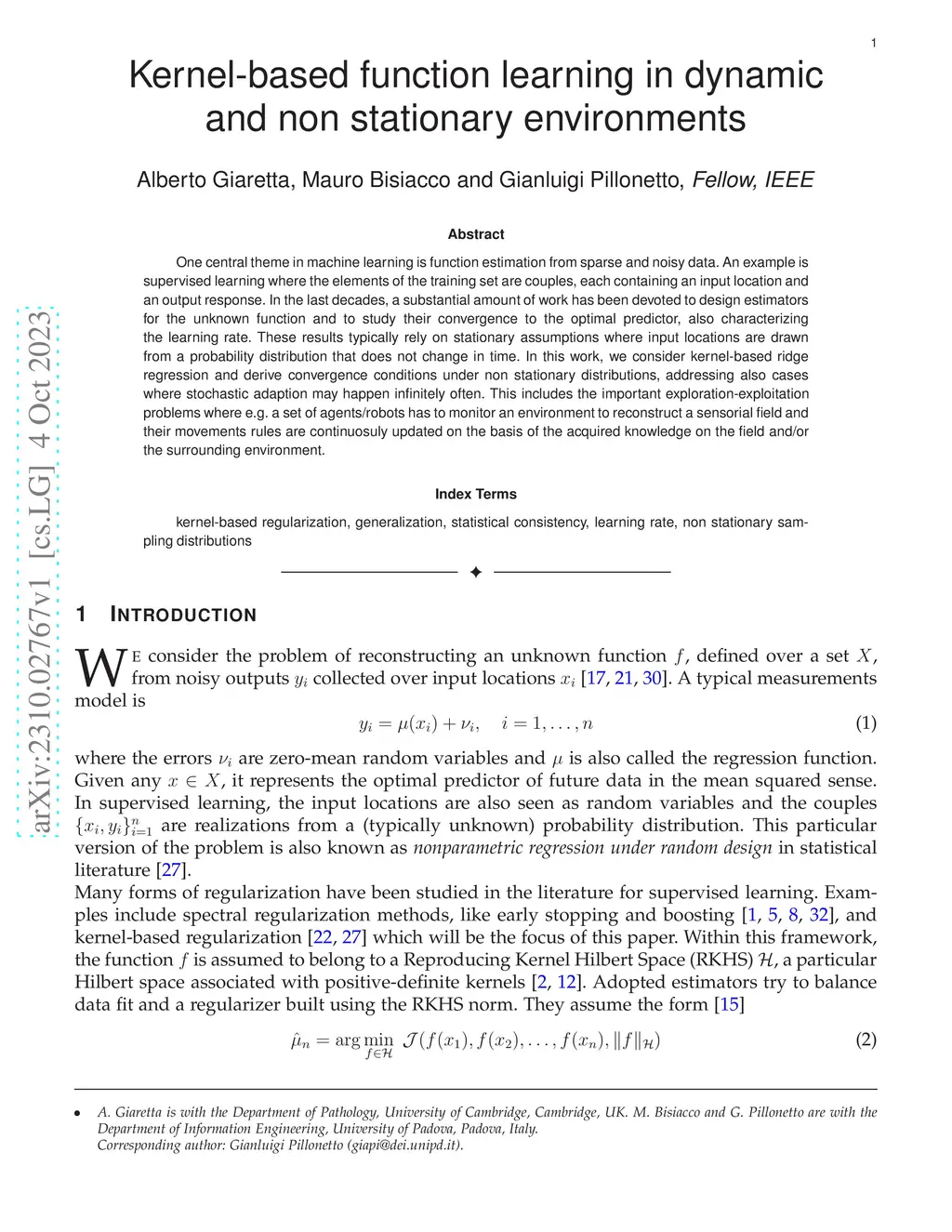 One central theme in machine learning is function estimation from sparse and noisy data. An example is supervised learning where the elements of the training set are couples, each containing an input location and an output response. In the last decades, a substantial amount of work has been devoted to design estimators for the unknown function and to study their convergence to the optimal predictor, also characterizing the learning rate. These results typically rely on stationary assumptions where input locations are drawn from a probability distribution that does not change in time. In this work, we consider kernel-based ridge regression and derive convergence conditions under non stationary distributions, addressing also cases where stochastic adaption may happen infinitely often. This includes the important exploration-exploitation problems where e.g. a set of agents/robots has to monitor an environment to reconstruct a sensorial field and their movements rules are continuously updated on the basis of the acquired knowledge on the field and/or the surrounding environment.