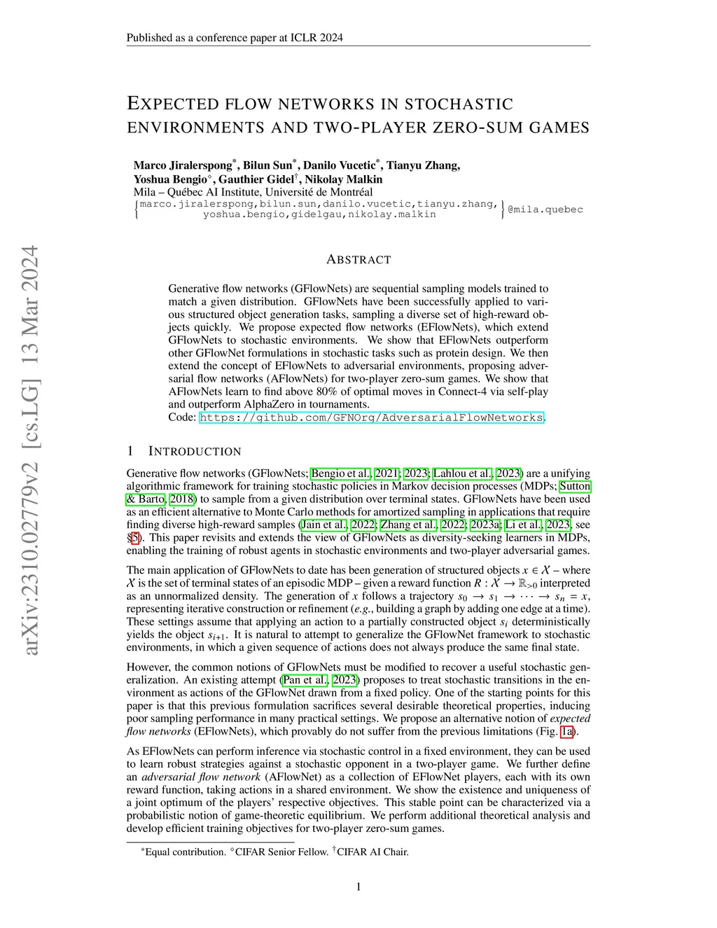 Generative flow networks (GFlowNets) are sequential sampling models trained to match a given distribution. GFlowNets have been successfully applied to various structured object generation tasks, sampling a diverse set of high-reward objects quickly. We propose expected flow networks (EFlowNets), which extend GFlowNets to stochastic environments. We show that EFlowNets outperform other GFlowNet formulations in stochastic tasks such as protein design. We then extend the concept of EFlowNets to adversarial environments, proposing adversarial flow networks (AFlowNets) for two-player zero-sum games. We show that AFlowNets learn to find above 80% of optimal moves in Connect-4 via self-play and outperform AlphaZero in tournaments.