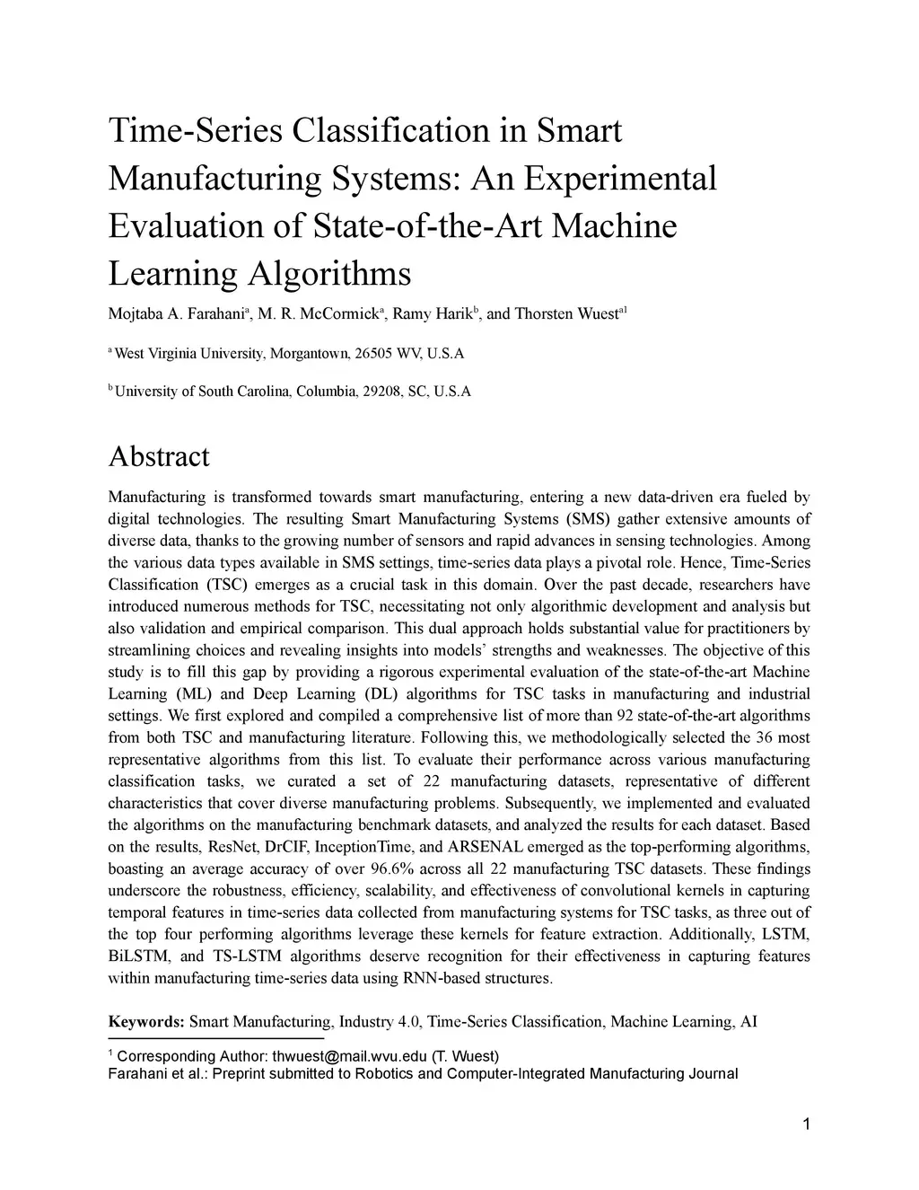 Time-Series Classification in Smart Manufacturing Systems: An