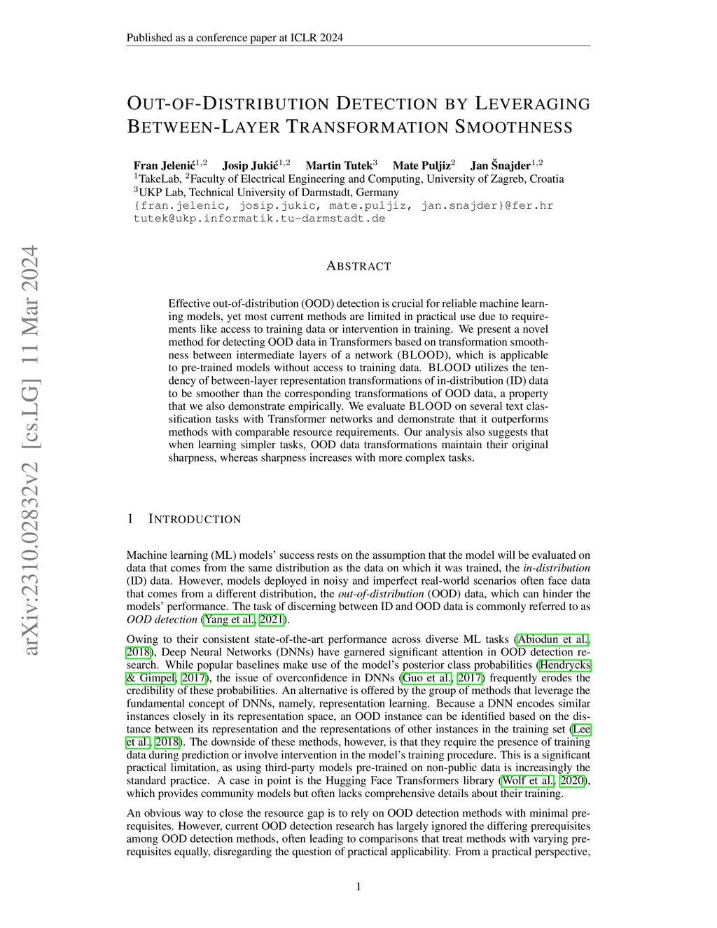 Effective out-of-distribution (OOD) detection is crucial for reliable machine learning models, yet most current methods are limited in practical use due to requirements like access to training data or intervention in training. We present a novel method for detecting OOD data in Transformers based on transformation smoothness between intermediate layers of a network (BLOOD), which is applicable to pre-trained models without access to training data. BLOOD utilizes the tendency of between-layer representation transformations of in-distribution (ID) data to be smoother than the corresponding transformations of OOD data, a property that we also demonstrate empirically. We evaluate BLOOD on several text classification tasks with Transformer networks and demonstrate that it outperforms methods with comparable resource requirements. Our analysis also suggests that when learning simpler tasks, OOD data transformations maintain their original sharpness, whereas sharpness increases with more complex tasks.