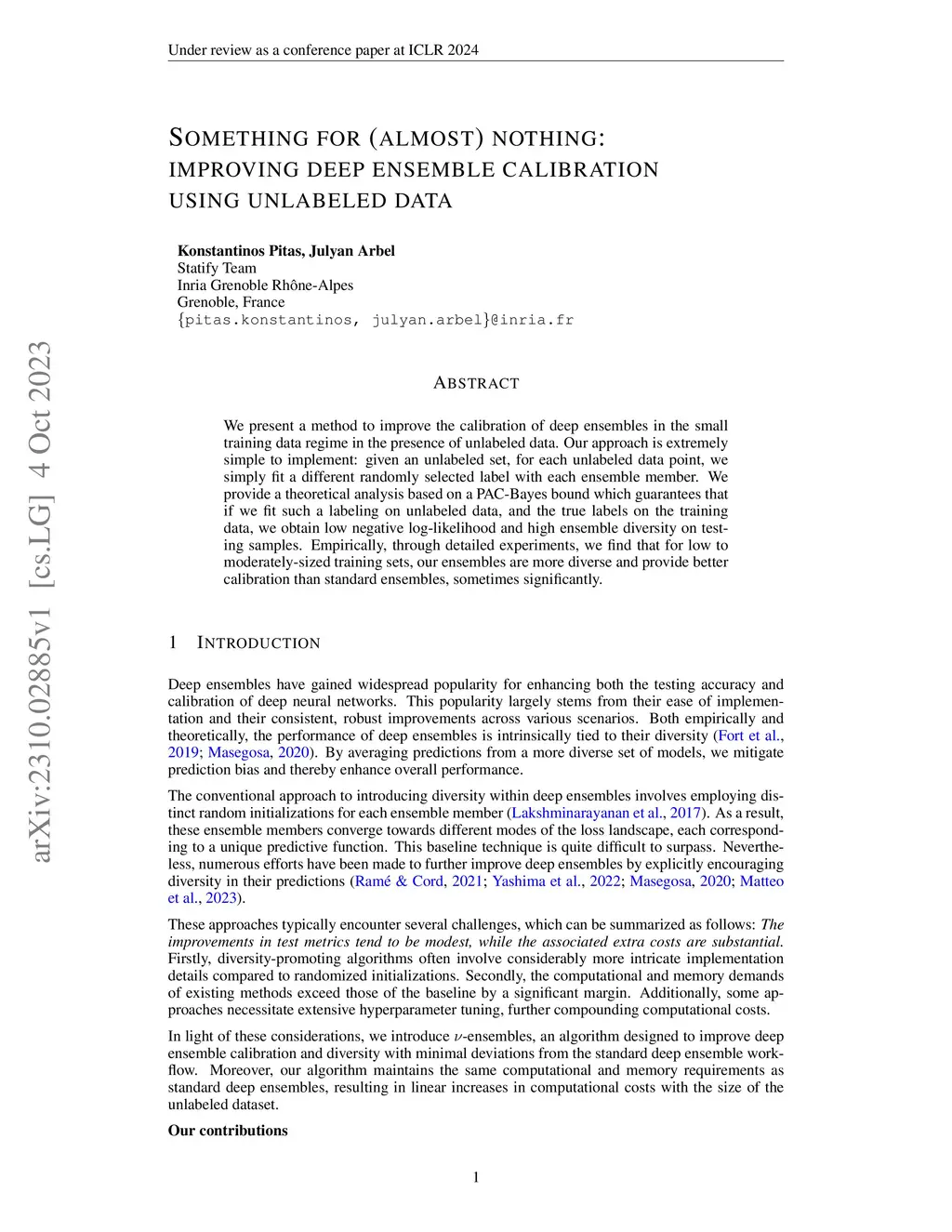 We present a method to improve the calibration of deep ensembles in the small training data regime in the presence of unlabeled data. Our approach is extremely simple to implement: given an unlabeled set, for each unlabeled data point, we simply fit a different randomly selected label with each ensemble member. We provide a theoretical analysis based on a PAC-Bayes bound which guarantees that if we fit such a labeling on unlabeled data, and the true labels on the training data, we obtain low negative log-likelihood and high ensemble diversity on testing samples. Empirically, through detailed experiments, we find that for low to moderately-sized training sets, our ensembles are more diverse and provide better calibration than standard ensembles, sometimes significantly.