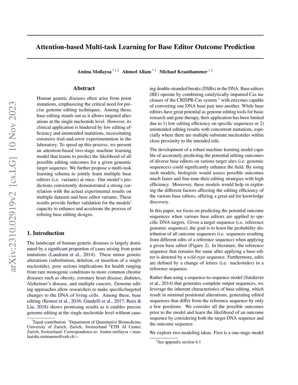 Human genetic diseases often arise from point mutations, emphasizing the critical need for precise genome editing techniques. Among these, base editing stands out as it allows targeted alterations at the single nucleotide level. However, its clinical application is hindered by low editing efficiency and unintended mutations, necessitating extensive trial-and-error experimentation in the laboratory. To speed up this process, we present an attention-based two-stage machine learning model that learns to predict the likelihood of all possible editing outcomes for a given genomic target sequence. We further propose a multi-task learning schema to jointly learn multiple base editors (i.e. variants) at once. Our model's predictions consistently demonstrated a strong correlation with the actual experimental results on multiple datasets and base editor variants. These results provide further validation for the models' capacity to enhance and accelerate the process of refining base editing designs.