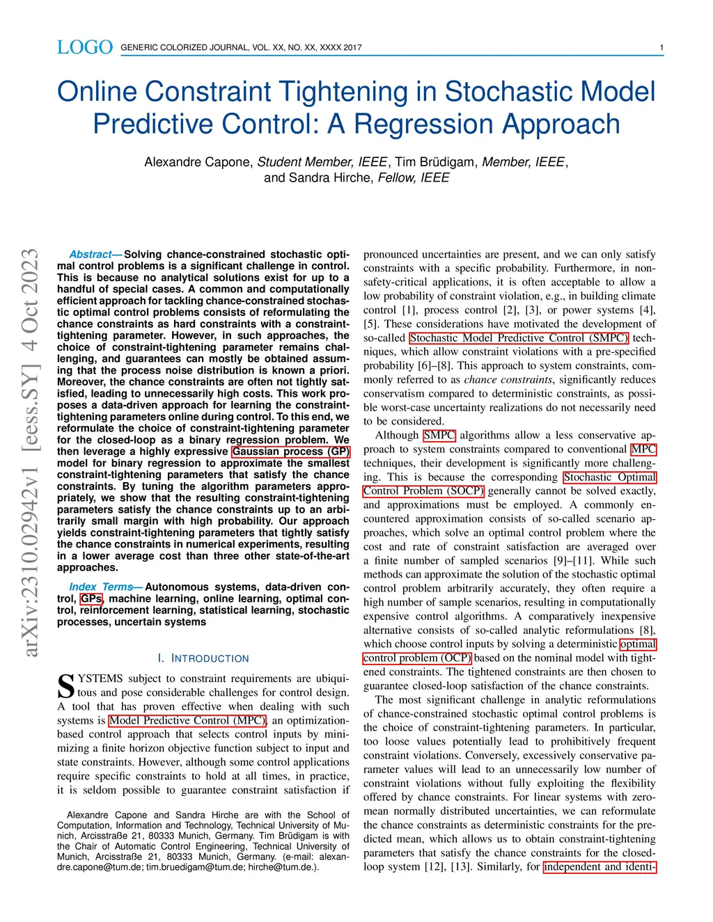 Solving chance-constrained stochastic optimal control problems is a significant challenge in control. This is because no analytical solutions exist for up to a handful of special cases. A common and computationally efficient approach for tackling chance-constrained stochastic optimal control problems consists of reformulating the chance constraints as hard constraints with a constraint-tightening parameter. However, in such approaches, the choice of constraint-tightening parameter remains challenging, and guarantees can mostly be obtained assuming that the process noise distribution is known a priori. Moreover, the chance constraints are often not tightly satisfied, leading to unnecessarily high costs. This work proposes a data-driven approach for learning the constraint-tightening parameters online during control. To this end, we reformulate the choice of constraint-tightening parameter for the closed-loop as a binary regression problem. We then leverage a highly expressive \gls{gp} model for binary regression to approximate the smallest constraint-tightening parameters that satisfy the chance constraints. By tuning the algorithm parameters appropriately, we show that the resulting constraint-tightening parameters satisfy the chance constraints up to an arbitrarily small margin with high probability. Our approach yields constraint-tightening parameters that tightly satisfy the chance constraints in numerical experiments, resulting in a lower average cost than three other state-of-the-art approaches.