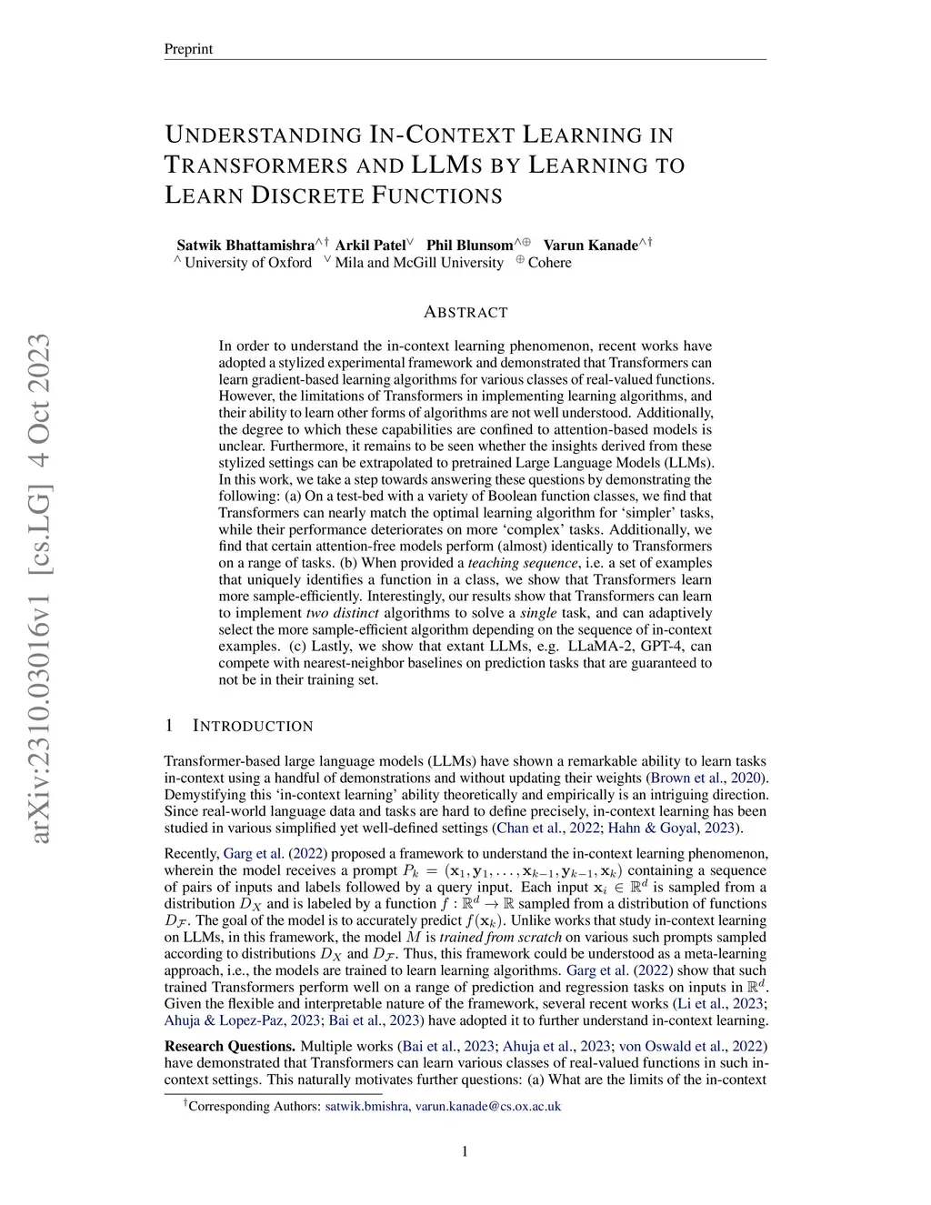 In order to understand the in-context learning phenomenon, recent works have adopted a stylized experimental framework and demonstrated that Transformers can learn gradient-based learning algorithms for various classes of real-valued functions. However, the limitations of Transformers in implementing learning algorithms, and their ability to learn other forms of algorithms are not well understood. Additionally, the degree to which these capabilities are confined to attention-based models is unclear. Furthermore, it remains to be seen whether the insights derived from these stylized settings can be extrapolated to pretrained Large Language Models (LLMs). In this work, we take a step towards answering these questions by demonstrating the following: (a) On a test-bed with a variety of Boolean function classes, we find that Transformers can nearly match the optimal learning algorithm for 'simpler' tasks, while their performance deteriorates on more 'complex' tasks. Additionally, we find that certain attention-free models perform (almost) identically to Transformers on a range of tasks. (b) When provided a teaching sequence, i.e. a set of examples that uniquely identifies a function in a class, we show that Transformers learn more sample-efficiently. Interestingly, our results show that Transformers can learn to implement two distinct algorithms to solve a single task, and can adaptively select the more sample-efficient algorithm depending on the sequence of in-context examples. (c) Lastly, we show that extant LLMs, e.g. LLaMA-2, GPT-4, can compete with nearest-neighbor baselines on prediction tasks that are guaranteed to not be in their training set.