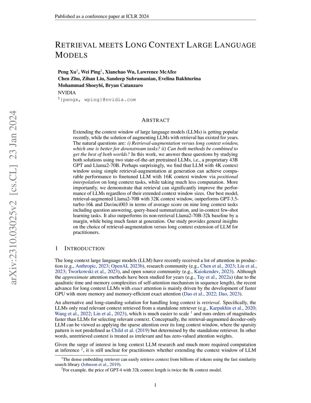 Extending the context window of large language models (LLMs) is getting popular recently, while the solution of augmenting LLMs with retrieval has existed for years. The natural questions are: i) Retrieval-augmentation versus long context window, which one is better for downstream tasks? ii) Can both methods be combined to get the best of both worlds? In this work, we answer these questions by studying both solutions using two state-of-the-art pretrained LLMs, i.e., a proprietary 43B GPT and Llama2-70B. Perhaps surprisingly, we find that LLM with 4K context window using simple retrieval-augmentation at generation can achieve comparable performance to finetuned LLM with 16K context window via positional interpolation on long context tasks, while taking much less computation. More importantly, we demonstrate that retrieval can significantly improve the performance of LLMs regardless of their extended context window sizes. Our best model, retrieval-augmented Llama2-70B with 32K context window, outperforms GPT-3.5-turbo-16k and Davinci003 in terms of average score on nine long context tasks including question answering, query-based summarization, and in-context few-shot learning tasks. It also outperforms its non-retrieval Llama2-70B-32k baseline by a margin, while being much faster at generation. Our study provides general insights on the choice of retrieval-augmentation versus long context extension of LLM for practitioners.