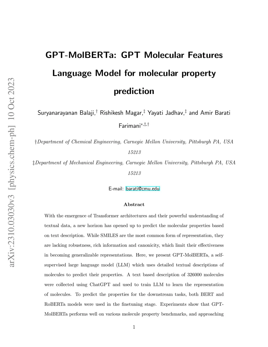 GPT-MolBERTa: GPT Molecular Features Language Model for molecular
