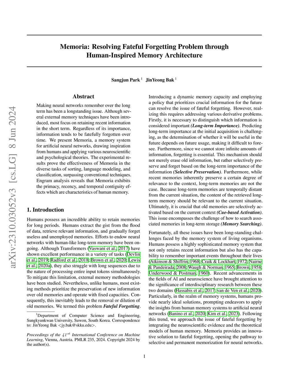 Memoria: Resolving Fateful Forgetting Problem through Human-Inspired