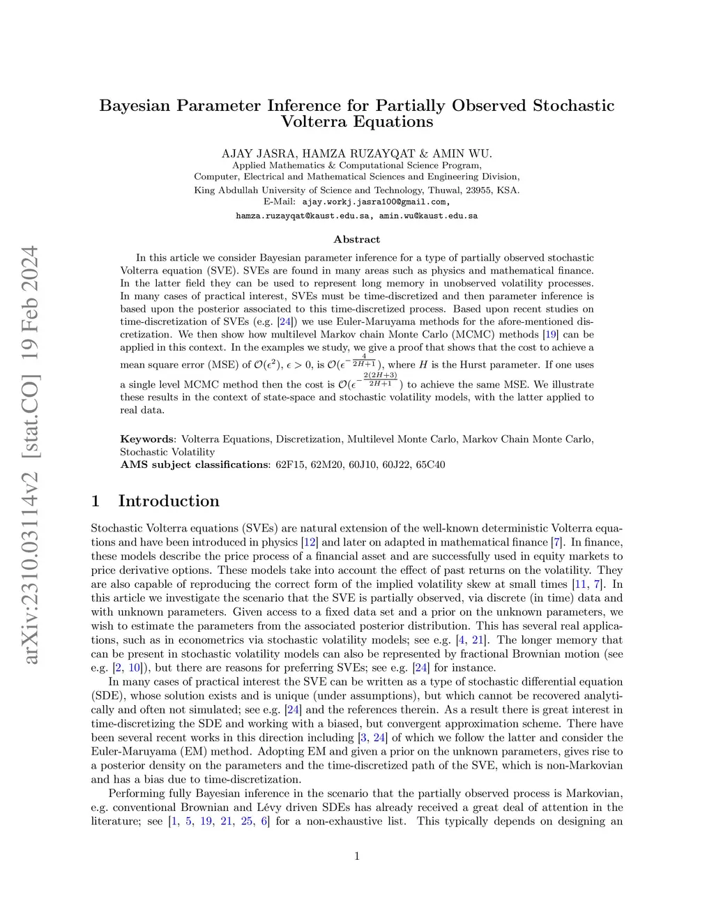 In this article we consider Bayesian parameter inference for a type of partially observed stochastic Volterra equation (SVE). SVEs are found in many areas such as physics and mathematical finance. In the latter field they can be used to represent long memory in unobserved volatility processes. In many cases of practical interest, SVEs must be time-discretized and then parameter inference is based upon the posterior associated to this time-discretized process. Based upon recent studies on time-discretization of SVEs (e.g. Richard et al. 2021), we use Euler-Maruyama methods for the afore-mentioned discretization. We then show how multilevel Markov chain Monte Carlo (MCMC) methods (Jasra et al. 2018) can be applied in this context. In the examples we study, we give a proof that shows that the cost to achieve a mean square error (MSE) of , , is {, where is the Hurst parameter. If one uses a single level MCMC method then the cost is } to achieve the same MSE. We illustrate these results in the context of state-space and stochastic volatility models, with the latter applied to real data.