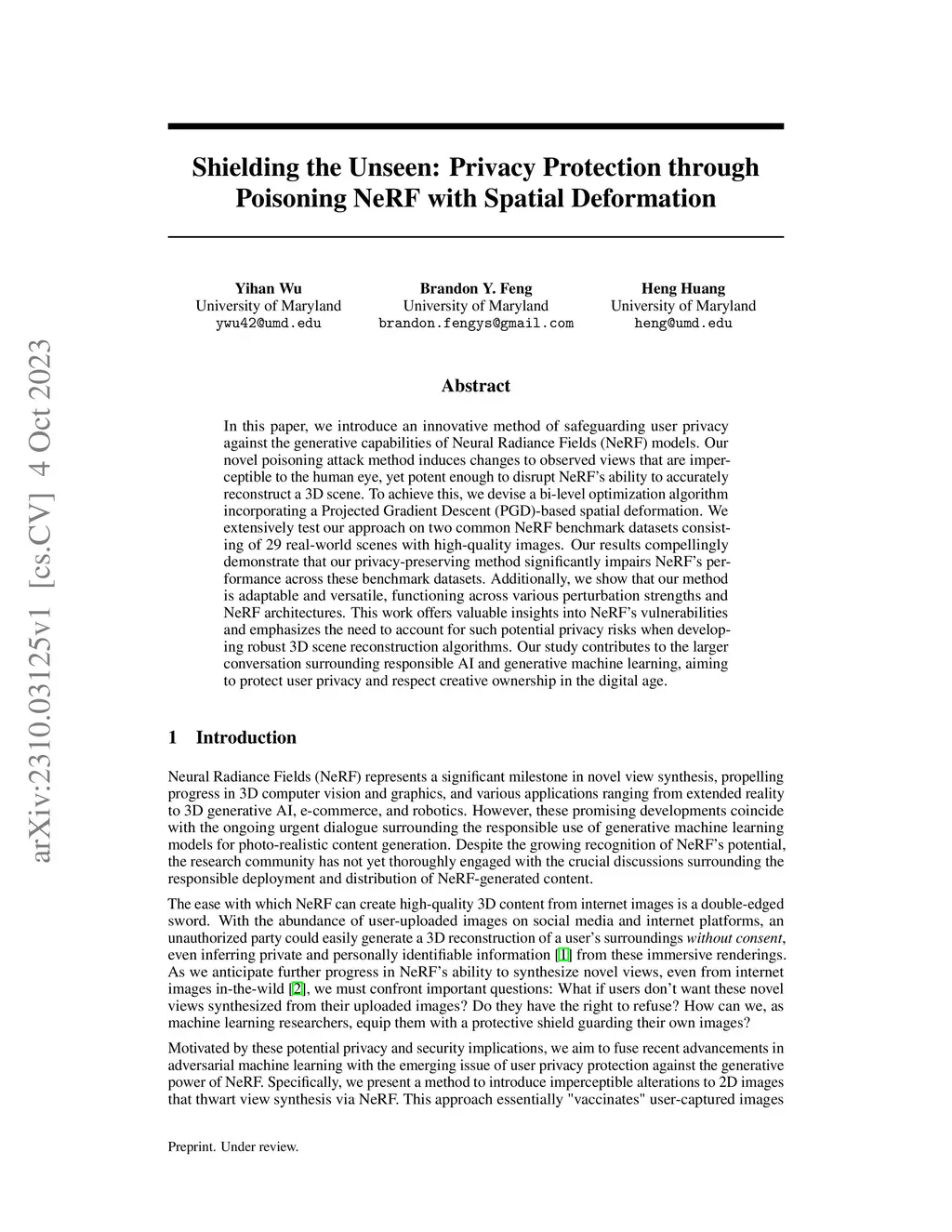 In this paper, we introduce an innovative method of safeguarding user privacy against the generative capabilities of Neural Radiance Fields (NeRF) models. Our novel poisoning attack method induces changes to observed views that are imperceptible to the human eye, yet potent enough to disrupt NeRF's ability to accurately reconstruct a 3D scene. To achieve this, we devise a bi-level optimization algorithm incorporating a Projected Gradient Descent (PGD)-based spatial deformation. We extensively test our approach on two common NeRF benchmark datasets consisting of 29 real-world scenes with high-quality images. Our results compellingly demonstrate that our privacy-preserving method significantly impairs NeRF's performance across these benchmark datasets. Additionally, we show that our method is adaptable and versatile, functioning across various perturbation strengths and NeRF architectures. This work offers valuable insights into NeRF's vulnerabilities and emphasizes the need to account for such potential privacy risks when developing robust 3D scene reconstruction algorithms. Our study contributes to the larger conversation surrounding responsible AI and generative machine learning, aiming to protect user privacy and respect creative ownership in the digital age.