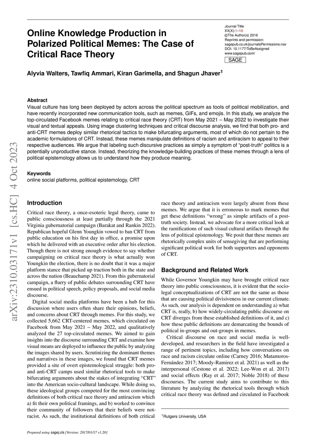 Visual culture has long been deployed by actors across the political spectrum as tools of political mobilization, and have recently incorporated new communication tools, such as memes, GIFs, and emojis. In this study, we analyze the top-circulated Facebook memes relating to critical race theory (CRT) from May 2021 - May 2022 to investigate their visual and textual appeals. Using image clustering techniques and critical discourse analysis, we find that both pro- and anti-CRT memes deploy similar rhetorical tactics to make bifurcating arguments, most of which do not pertain to the academic formulations of CRT. Instead, these memes manipulate definitions of racism and antiracism to appeal to their respective audiences. We argue that labeling such discursive practices as simply a symptom of "post-truth" politics is a potentially unproductive stance. Instead, theorizing the knowledge-building practices of these memes through a lens of political epistemology allows us to understand how they produce meaning.
