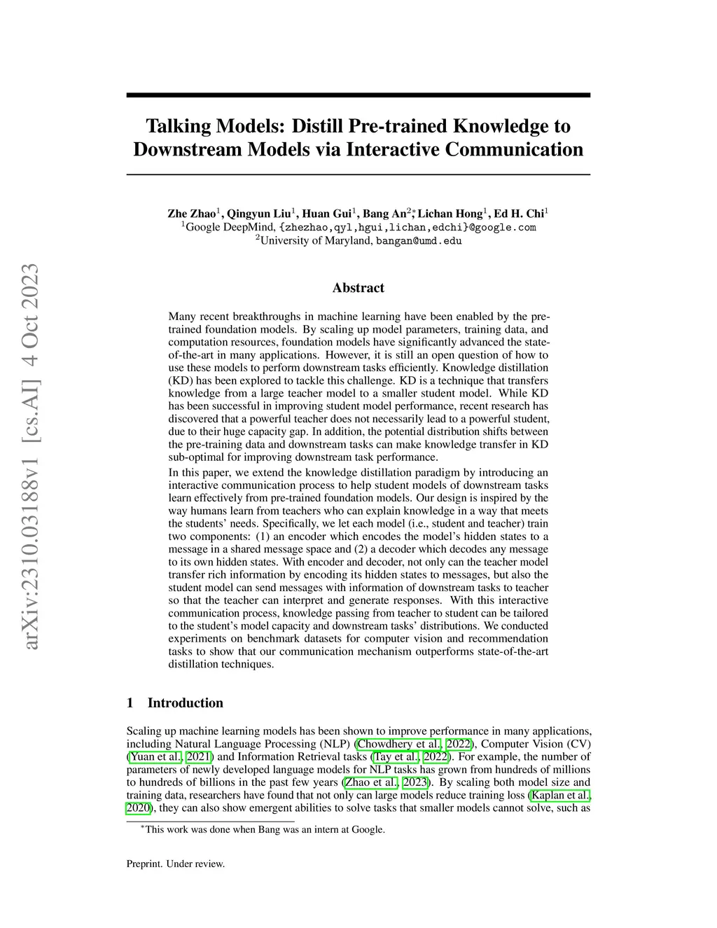 Many recent breakthroughs in machine learning have been enabled by the pre-trained foundation models. By scaling up model parameters, training data, and computation resources, foundation models have significantly advanced the state-of-the-art in many applications. However, it is still an open question of how to use these models to perform downstream tasks efficiently. Knowledge distillation (KD) has been explored to tackle this challenge. KD transfers knowledge from a large teacher model to a smaller student model. While KD has been successful in improving student model performance, recent research has discovered that a powerful teacher does not necessarily lead to a powerful student, due to their huge capacity gap. In addition, the potential distribution shifts between the pre-training data and downstream tasks can make knowledge transfer in KD sub-optimal for improving downstream task performance. In this paper, we extend KD with an interactive communication process to help students of downstream tasks learn effectively from pre-trained foundation models. Our design is inspired by the way humans learn from teachers who can explain knowledge in a way that meets the students' needs. Specifically, we let each model (i.e., student and teacher) train two components: (1) an encoder encoding the model's hidden states to a message and (2) a decoder decoding any messages to its own hidden states. With encoder and decoder, not only can the teacher transfer rich information by encoding its hidden states, but also the student can send messages with information of downstream tasks to the teacher. Therefore, knowledge passing from teacher to student can be tailored to the student's capacity and downstream tasks' distributions. We conducted experiments on benchmark datasets to show that our communication mechanism outperforms state-of-the-art distillation techniques.