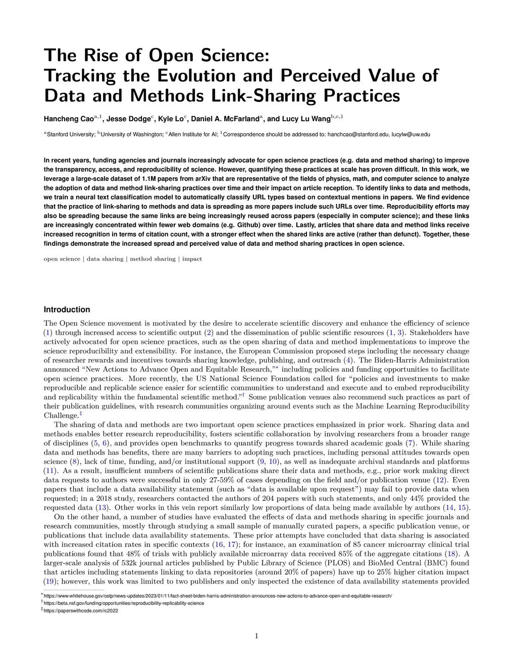 In recent years, funding agencies and journals increasingly advocate for open science practices (e.g. data and method sharing) to improve the transparency, access, and reproducibility of science. However, quantifying these practices at scale has proven difficult. In this work, we leverage a large-scale dataset of 1.1M papers from arXiv that are representative of the fields of physics, math, and computer science to analyze the adoption of data and method link-sharing practices over time and their impact on article reception. To identify links to data and methods, we train a neural text classification model to automatically classify URL types based on contextual mentions in papers. We find evidence that the practice of link-sharing to methods and data is spreading as more papers include such URLs over time. Reproducibility efforts may also be spreading because the same links are being increasingly reused across papers (especially in computer science); and these links are increasingly concentrated within fewer web domains (e.g. Github) over time. Lastly, articles that share data and method links receive increased recognition in terms of citation count, with a stronger effect when the shared links are active (rather than defunct). Together, these findings demonstrate the increased spread and perceived value of data and method sharing practices in open science.