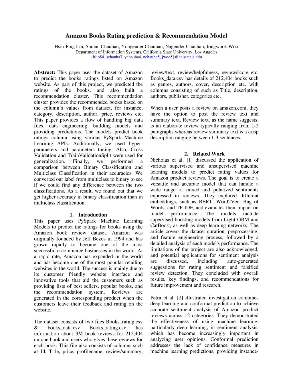 This paper uses the dataset of Amazon to predict the books ratings listed on Amazon website. As part of this project, we predicted the ratings of the books, and also built a recommendation cluster. This recommendation cluster provides the recommended books based on the column's values from dataset, for instance, category, description, author, price, reviews etc. This paper provides a flow of handling big data files, data engineering, building models and providing predictions. The models predict book ratings column using various PySpark Machine Learning APIs. Additionally, we used hyper-parameters and parameters tuning. Also, Cross Validation and TrainValidationSplit were used for generalization. Finally, we performed a comparison between Binary Classification and Multiclass Classification in their accuracies. We converted our label from multiclass to binary to see if we could find any difference between the two classifications. As a result, we found out that we get higher accuracy in binary classification than in multiclass classification.