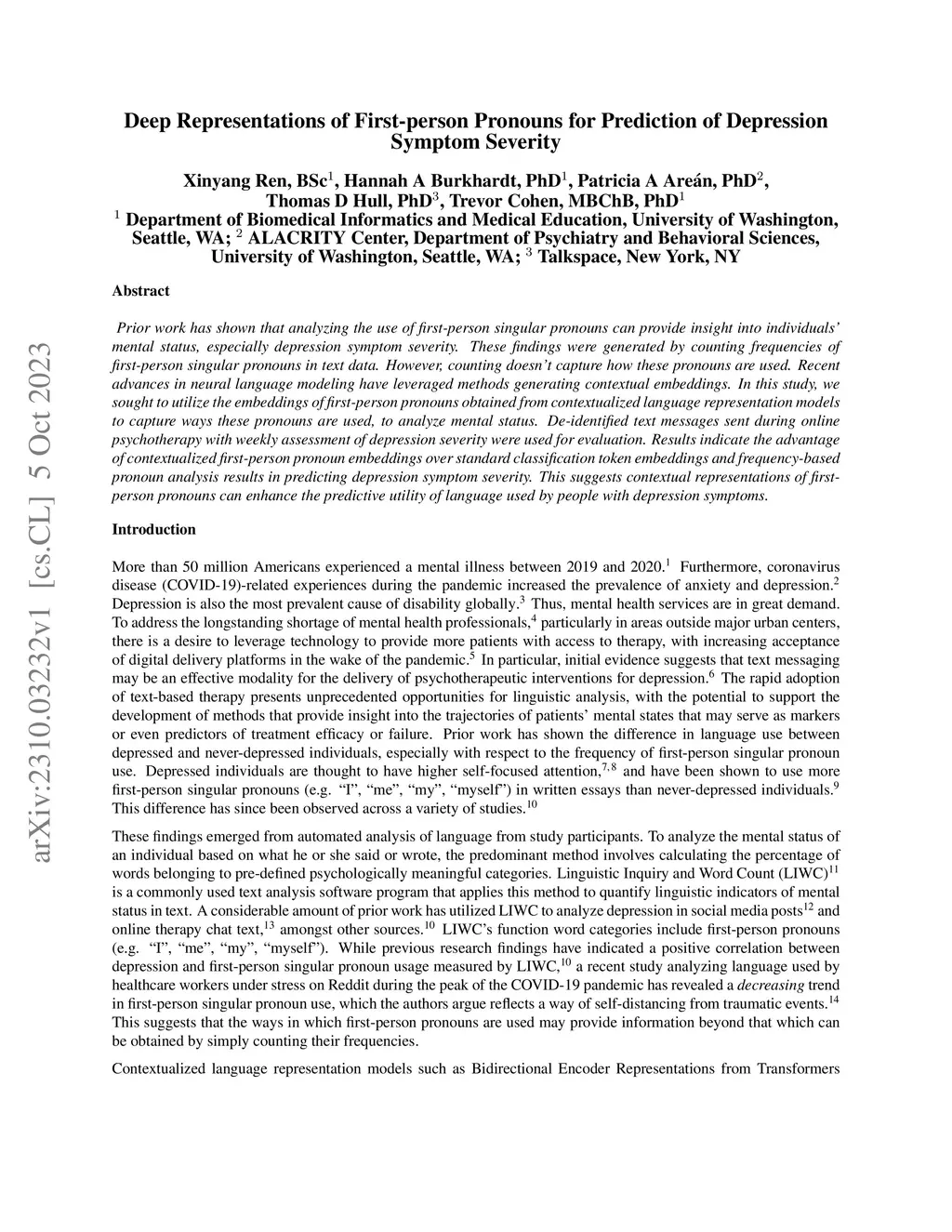 Prior work has shown that analyzing the use of first-person singular pronouns can provide insight into individuals' mental status, especially depression symptom severity. These findings were generated by counting frequencies of first-person singular pronouns in text data. However, counting doesn't capture how these pronouns are used. Recent advances in neural language modeling have leveraged methods generating contextual embeddings. In this study, we sought to utilize the embeddings of first-person pronouns obtained from contextualized language representation models to capture ways these pronouns are used, to analyze mental status. De-identified text messages sent during online psychotherapy with weekly assessment of depression severity were used for evaluation. Results indicate the advantage of contextualized first-person pronoun embeddings over standard classification token embeddings and frequency-based pronoun analysis results in predicting depression symptom severity. This suggests contextual representations of first-person pronouns can enhance the predictive utility of language used by people with depression symptoms.