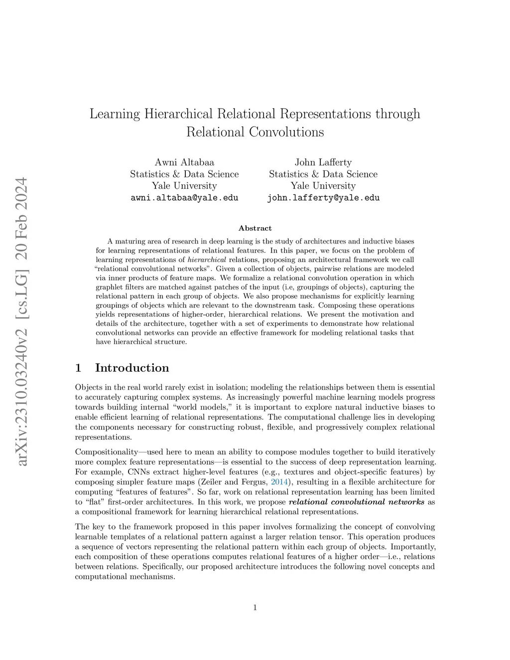 A maturing area of research in deep learning is the study of architectures and inductive biases for learning representations of relational features. In this paper, we focus on the problem of learning representations of hierarchical relations, proposing an architectural framework we call "relational convolutional networks". Given a collection of objects, pairwise relations are modeled via inner products of feature maps. We formalize a relational convolution operation in which graphlet filters are matched against patches of the input (i.e, groupings of objects), capturing the relational pattern in each group of objects. We also propose mechanisms for explicitly learning groupings of objects which are relevant to the downstream task. Composing these operations yields representations of higher-order, hierarchical relations. We present the motivation and details of the architecture, together with a set of experiments to demonstrate how relational convolutional networks can provide an effective framework for modeling relational tasks that have hierarchical structure.