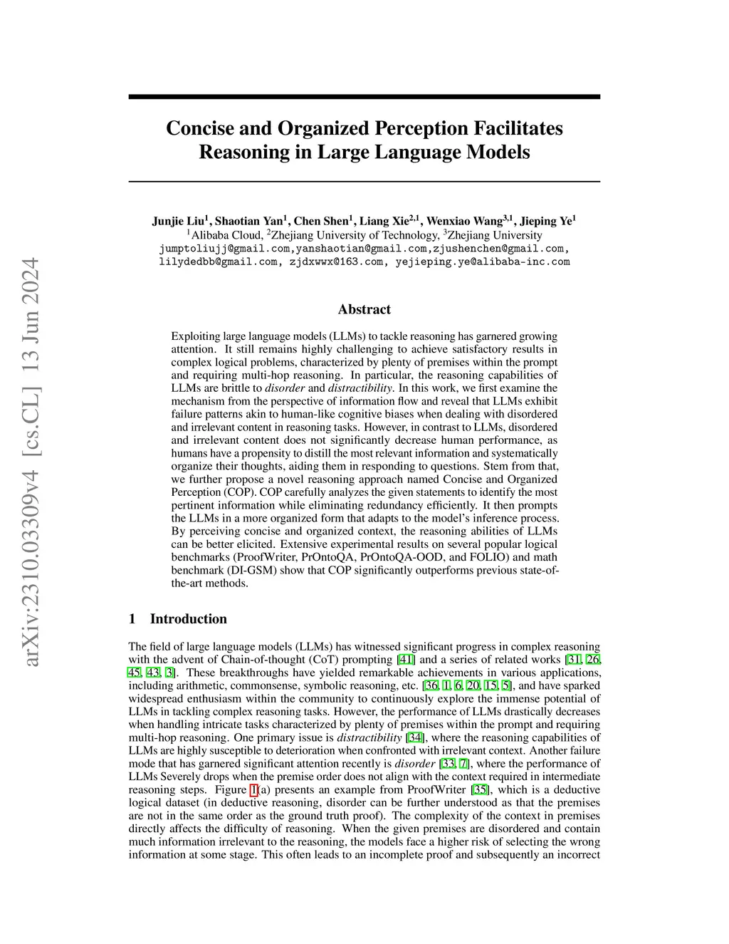 Exploiting large language models (LLMs) to tackle reasoning has garnered growing attention. It still remains highly challenging to achieve satisfactory results in complex logical problems, characterized by plenty of premises within the context and requiring multi-hop reasoning. In particular, the reasoning capabilities of LLMs are brittle to disorder and distractibility. In this work, we first examine the mechanism from the perspective of information flow and reveal that LLMs confront difficulties akin to human-like cognitive biases when dealing with disordered and irrelevant content in reasoning tasks. However, in contrast to LLMs, disordered and irrelevant content does not significantly decrease human performance, as humans have a propensity to distill the most relevant information and systematically organize their thoughts, aiding them in responding tothis http URLfrom that, we further propose a novel reasoning approach named Concise and Organized Perception (COP). COP carefully analyzes the given statements to identify the most pertinent information while eliminating redundancy efficiently. It then prompts the LLMs in a more organized form that adapts to the model's inference process. By perceiving concise and organized context, the reasoning abilities of LLMs can be better elicited. Extensive experimental results on several popular logical benchmarks (ProofWriter, PrOntoQA, PrOntoQA-OOD, and FOLIO) and mathematical benchmark (DI-GSM) show that COP significantly outperforms previous state-of-the-art methods.