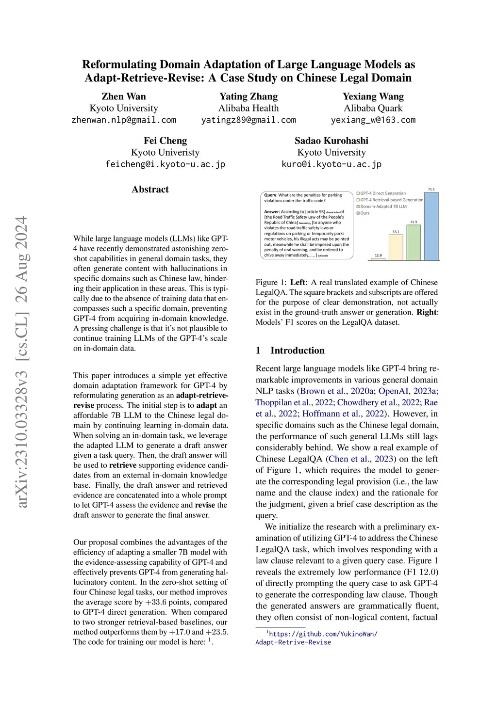 While large language models (LLMs) like GPT-4 have recently demonstrated astonishing zero-shot capabilities in general domain tasks, they often generate content with hallucinations in specific domains such as Chinese law, hindering their application in these areas. This is typically due to the absence of training data that encompasses such a specific domain, preventing GPT-4 from acquiring in-domain knowledge. A pressing challenge is that it's not plausible to continue training LLMs of such scale on in-domain data. This paper introduces a simple and effective domain adaptation framework for GPT-4 by reformulating generation as an \textbf{adapt-retrieve-revise} process. The initial step is to \textbf{adapt} an affordable 7B LLM to the target domain by continuing learning on in-domain data. When solving a task, we leverage the adapted LLM to generate a draft answer given a task query. Then, the draft answer will be used to \textbf{retrieve} supporting evidence candidates from an external in-domain knowledge base. Finally, the draft answer and retrieved evidence are concatenated into a whole prompt to let GPT-4 assess the evidence and \textbf{revise} the draft answer to generate the final answer. Our proposal combines the advantages of the efficiency of adapting a smaller 7B model with the evidence-assessing capability of GPT-4 and effectively prevents GPT-4 from generating hallucinatory content. In the zero-shot setting of four Chinese legal tasks, our method improves accuracy by 33.3\% compared to the direct generation by GPT-4. When compared to two stronger retrieval-based baselines, our method outperforms them by 15.4\% and 23.9\%. Our code will be released