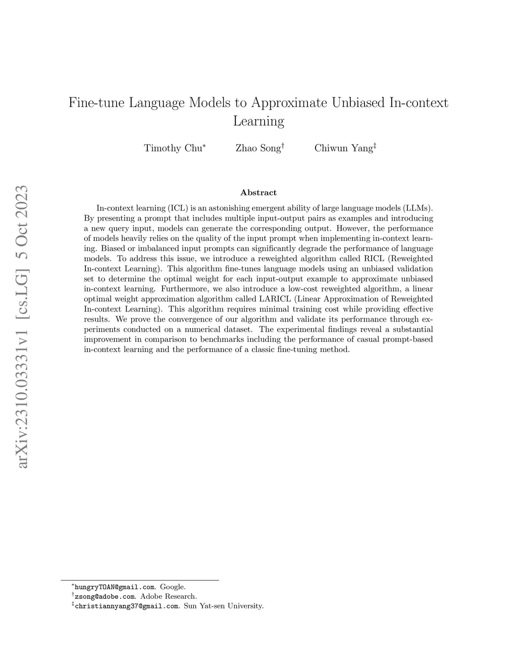 In-context learning (ICL) is an astonishing emergent ability of large language models (LLMs). By presenting a prompt that includes multiple input-output pairs as examples and introducing a new query input, models can generate the corresponding output. However, the performance of models heavily relies on the quality of the input prompt when implementing in-context learning. Biased or imbalanced input prompts can significantly degrade the performance of language models. To address this issue, we introduce a reweighted algorithm called RICL (Reweighted In-context Learning). This algorithm fine-tunes language models using an unbiased validation set to determine the optimal weight for each input-output example to approximate unbiased in-context learning. Furthermore, we also introduce a low-cost reweighted algorithm, a linear optimal weight approximation algorithm called LARICL (Linear Approximation of Reweighted In-context Learning). This algorithm requires minimal training cost while providing effective results. We prove the convergence of our algorithm and validate its performance through experiments conducted on a numerical dataset. The experimental findings reveal a substantial improvement in comparison to benchmarks including the performance of casual prompt-based in-context learning and the performance of a classic fine-tuning method.