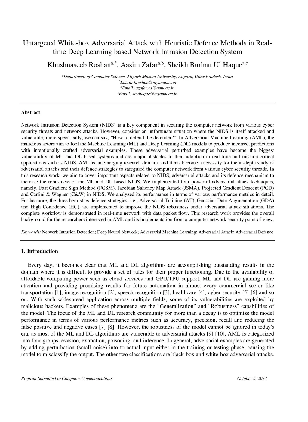 Network Intrusion Detection System (NIDS) is a key component in securing the computer network from various cyber security threats and network attacks. However, consider an unfortunate situation where the NIDS is itself attacked and vulnerable more specifically, we can say, How to defend the defender?. In Adversarial Machine Learning (AML), the malicious actors aim to fool the Machine Learning (ML) and Deep Learning (DL) models to produce incorrect predictions with intentionally crafted adversarial examples. These adversarial perturbed examples have become the biggest vulnerability of ML and DL based systems and are major obstacles to their adoption in real-time and mission-critical applications such as NIDS. AML is an emerging research domain, and it has become a necessity for the in-depth study of adversarial attacks and their defence strategies to safeguard the computer network from various cyber security threads. In this research work, we aim to cover important aspects related to NIDS, adversarial attacks and its defence mechanism to increase the robustness of the ML and DL based NIDS. We implemented four powerful adversarial attack techniques, namely, Fast Gradient Sign Method (FGSM), Jacobian Saliency Map Attack (JSMA), Projected Gradient Descent (PGD) and Carlini & Wagner (C&W) in NIDS. We analyzed its performance in terms of various performance metrics in detail. Furthermore, the three heuristics defence strategies, i.e., Adversarial Training (AT), Gaussian Data Augmentation (GDA) and High Confidence (HC), are implemented to improve the NIDS robustness under adversarial attack situations. The complete workflow is demonstrated in real-time network with data packet flow. This research work provides the overall background for the researchers interested in AML and its implementation from a computer network security point of view.
