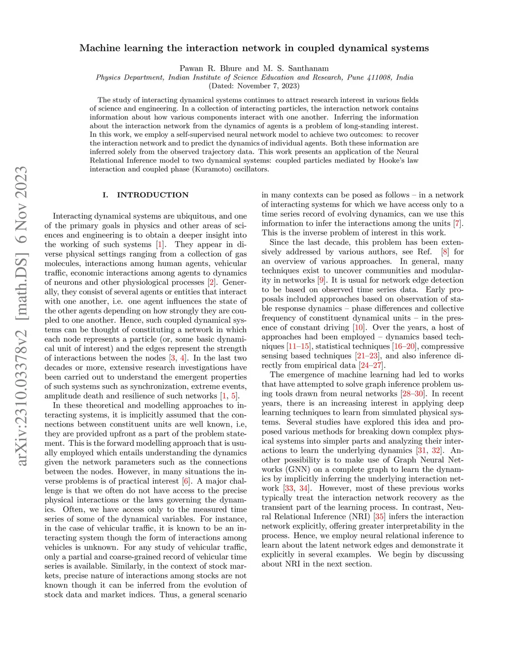 The study of interacting dynamical systems continues to attract research interest in various fields of science and engineering. In a collection of interacting particles, the interaction network contains information about how various components interact with one another. Inferring the information about the interaction network from the dynamics of agents is a problem of long-standing interest. In this work, we employ a self-supervised neural network model to achieve two outcomes: to recover the interaction network and to predict the dynamics of individual agents. Both these information are inferred solely from the observed trajectory data. This work presents an application of the Neural Relational Inference model to two dynamical systems: coupled particles mediated by Hooke's law interaction and coupled phase (Kuramoto) oscillators.