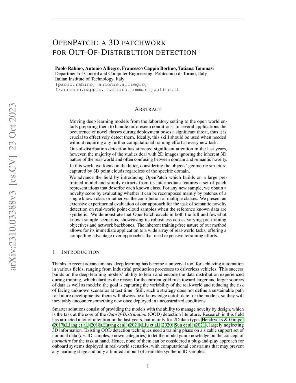 Moving deep learning models from the laboratory setting to the open world entails preparing them to handle unforeseen conditions. In several applications the occurrence of novel classes during deployment poses a significant threat, thus it is crucial to effectively detect them. Ideally, this skill should be used when needed without requiring any further computational training effort at every new task. Out-of-distribution detection has attracted significant attention in the last years, however the majority of the studies deal with 2D images ignoring the inherent 3D nature of the real-world and often confusing between domain and semantic novelty. In this work, we focus on the latter, considering the objects geometric structure captured by 3D point clouds regardless of the specific domain. We advance the field by introducing OpenPatch that builds on a large pre-trained model and simply extracts from its intermediate features a set of patch representations that describe each known class. For any new sample, we obtain a novelty score by evaluating whether it can be recomposed mainly by patches of a single known class or rather via the contribution of multiple classes. We present an extensive experimental evaluation of our approach for the task of semantic novelty detection on real-world point cloud samples when the reference known data are synthetic. We demonstrate that OpenPatch excels in both the full and few-shot known sample scenarios, showcasing its robustness across varying pre-training objectives and network backbones. The inherent training-free nature of our method allows for its immediate application to a wide array of real-world tasks, offering a compelling advantage over approaches that need expensive retraining efforts.