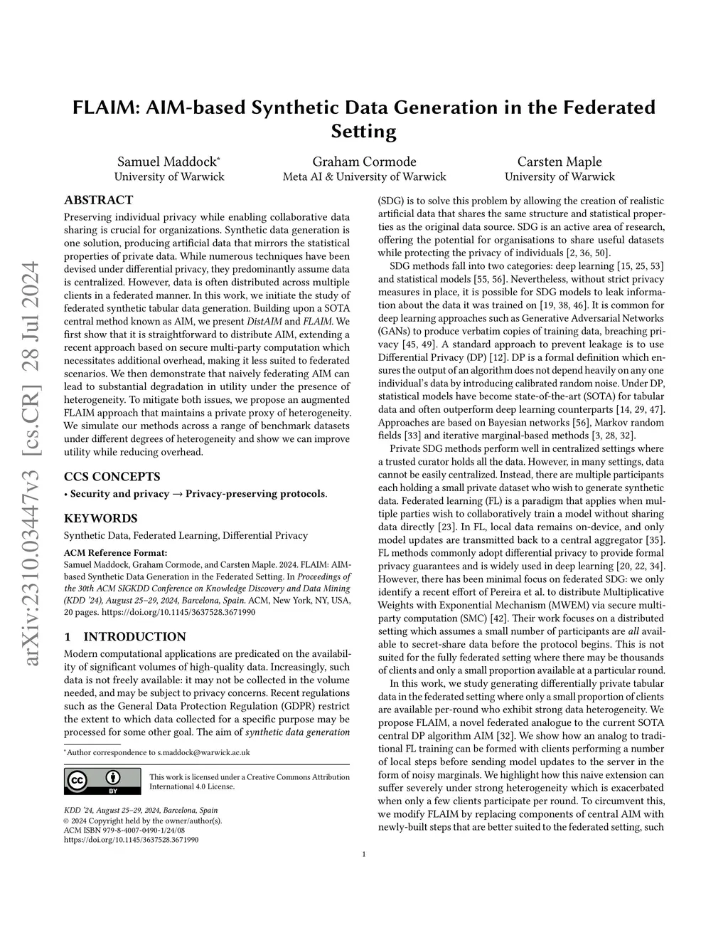 FLAIM: AIM-based Synthetic Data Generation in the Federated Setting