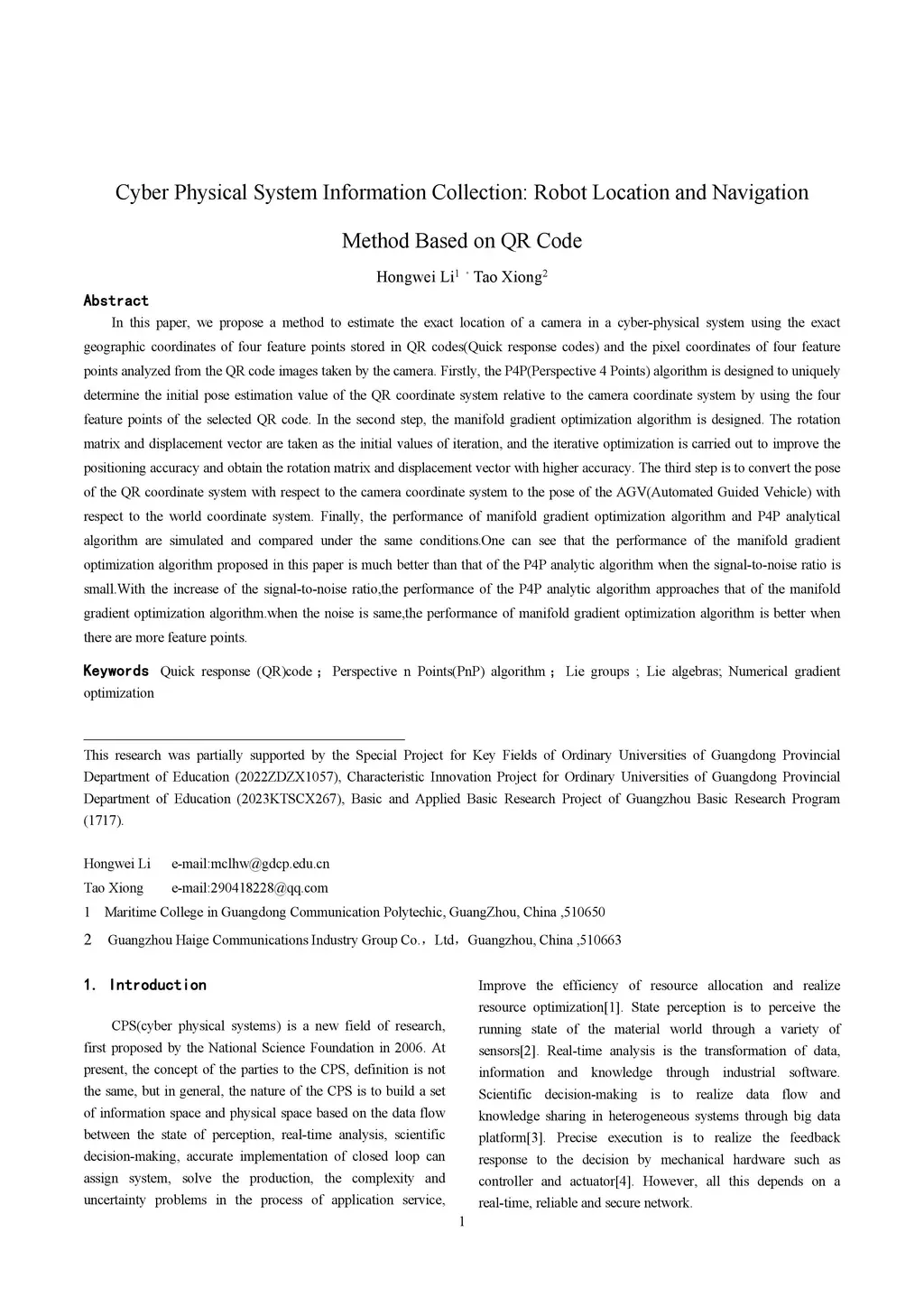In this paper, we propose a method to estimate the exact location of a camera in a cyber-physical system using the exact geographic coordinates of four feature points stored in QR codes(Quick response codes) and the pixel coordinates of four feature points analyzed from the QR code images taken by the camera. Firstly, the P4P(Perspective 4 Points) algorithm is designed to uniquely determine the initial pose estimation value of the QR coordinate system relative to the camera coordinate system by using the four feature points of the selected QR code. In the second step, the manifold gradient optimization algorithm is designed. The rotation matrix and displacement vector are taken as the initial values of iteration, and the iterative optimization is carried out to improve the positioning accuracy and obtain the rotation matrix and displacement vector with higher accuracy. The third step is to convert the pose of the QR coordinate system with respect to the camera coordinate system to the pose of the AGV(Automated Guided Vehicle) with respect to the world coordinate system. Finally, the performance of manifold gradient optimization algorithm and P4P analytical algorithm are simulated and compared under the same conditions.One can see that the performance of the manifold gradient optimization algorithm proposed in this paper is much better than that of the P4P analytic algorithm when the signal-to-noise ratio is small.With the increase of the signal-to-noise ratio,the performance of the P4P analytic algorithm approaches that of the manifold gradient optimization algorithm.when the noise is same,the performance of manifold gradient optimization algorithm is better when there are more feature points.