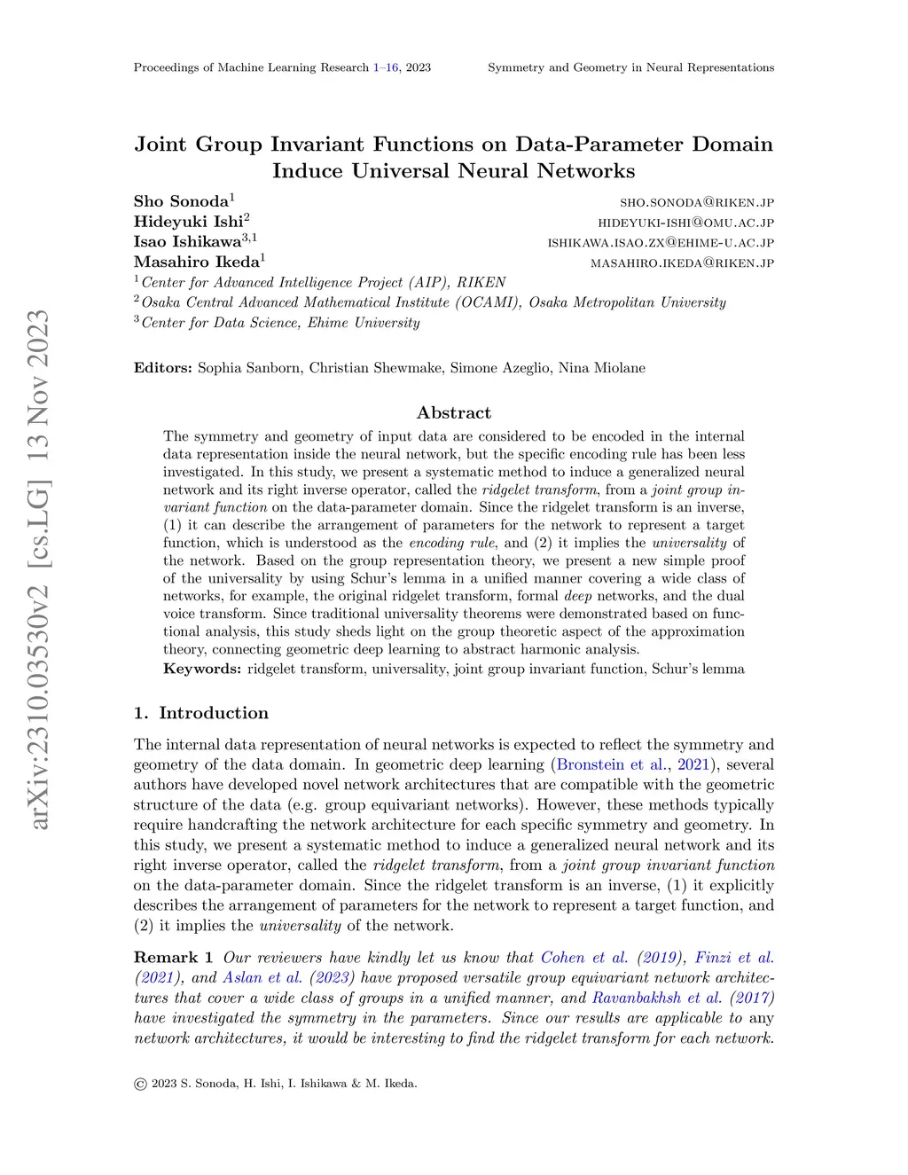 The symmetry and geometry of input data are considered to be encoded in the internal data representation inside the neural network, but the specific encoding rule has been less investigated. In this study, we present a systematic method to induce a generalized neural network and its right inverse operator, called the ridgelet transform, from a joint group invariant function on the data-parameter domain. Since the ridgelet transform is an inverse, (1) it can describe the arrangement of parameters for the network to represent a target function, which is understood as the encoding rule, and (2) it implies the universality of the network. Based on the group representation theory, we present a new simple proof of the universality by using Schur's lemma in a unified manner covering a wide class of networks, for example, the original ridgelet transform, formal deep networks, and the dual voice transform. Since traditional universality theorems were demonstrated based on functional analysis, this study sheds light on the group theoretic aspect of the approximation theory, connecting geometric deep learning to abstract harmonic analysis.