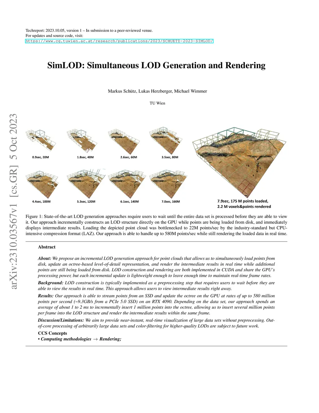 About: We propose an incremental LOD generation approach for point clouds that allows us to simultaneously load points from disk, update an octree-based level-of-detail representation, and render the intermediate results in real time while additional points are still being loaded from disk. LOD construction and rendering are both implemented in CUDA and share the GPU's processing power, but each incremental update is lightweight enough to leave enough time to maintain real-time frame rates. Background: LOD construction is typically implemented as a preprocessing step that requires users to wait before they are able to view the results in real time. This approach allows users to view intermediate results right away. Results: Our approach is able to stream points from an SSD and update the octree on the GPU at rates of up to 580 million points per second (~9.3GB/s from a PCIe 5.0 SSD) on an RTX 4090. Depending on the data set, our approach spends an average of about 1 to 2 ms to incrementally insert 1 million points into the octree, allowing us to insert several million points per frame into the LOD structure and render the intermediate results within the same frame. Discussion/Limitations: We aim to provide near-instant, real-time visualization of large data sets without preprocessing. Out-of-core processing of arbitrarily large data sets and color-filtering for higher-quality LODs are subject to future work.
