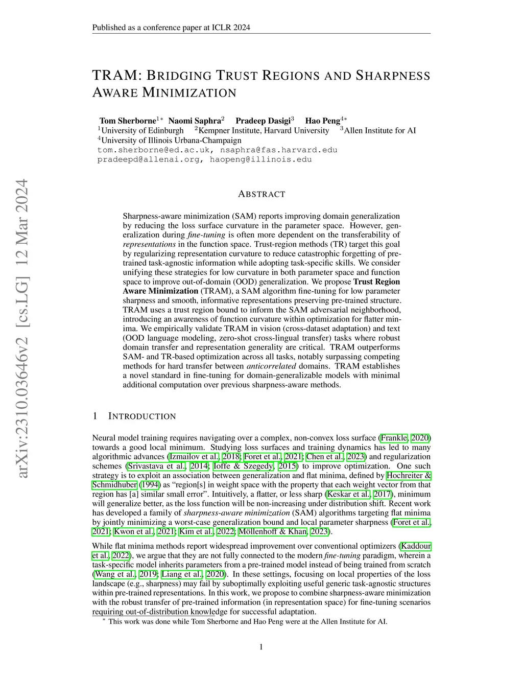 TRAM: Bridging Trust Regions and Sharpness Aware Minimization