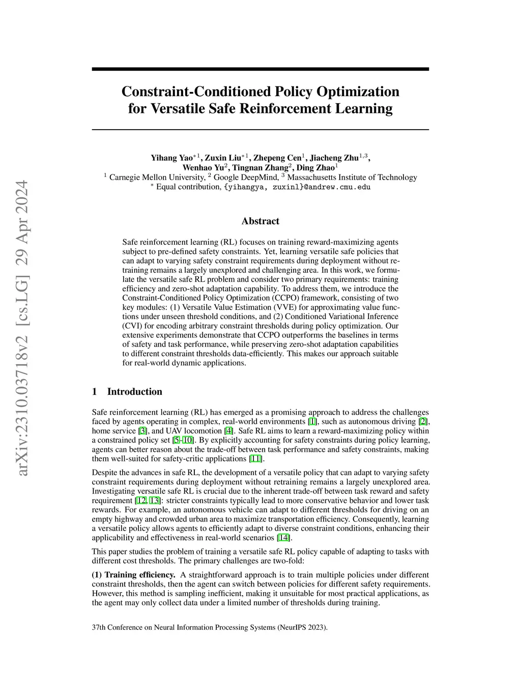 Safe reinforcement learning (RL) focuses on training reward-maximizing agents subject to pre-defined safety constraints. Yet, learning versatile safe policies that can adapt to varying safety constraint requirements during deployment without retraining remains a largely unexplored and challenging area. In this work, we formulate the versatile safe RL problem and consider two primary requirements: training efficiency and zero-shot adaptation capability. To address them, we introduce the Conditioned Constrained Policy Optimization (CCPO) framework, consisting of two key modules: (1) Versatile Value Estimation (VVE) for approximating value functions under unseen threshold conditions, and (2) Conditioned Variational Inference (CVI) for encoding arbitrary constraint thresholds during policy optimization. Our extensive experiments demonstrate that CCPO outperforms the baselines in terms of safety and task performance while preserving zero-shot adaptation capabilities to different constraint thresholds data-efficiently. This makes our approach suitable for real-world dynamic applications.