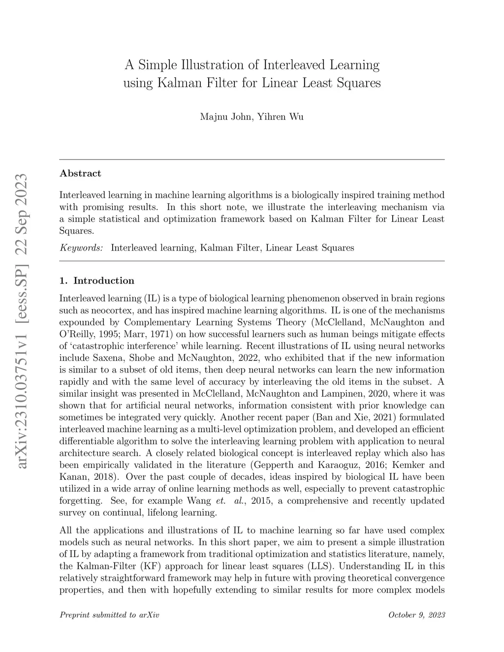 Interleaved learning in machine learning algorithms is a biologically inspired training method with promising results. In this short note, we illustrate the interleaving mechanism via a simple statistical and optimization framework based on Kalman Filter for Linear Least Squares.
