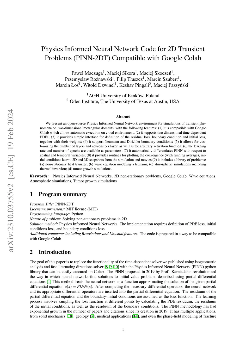 We present an open-source Physics Informed Neural Network environment for simulations of transient phenomena on two-dimensional rectangular domains, with the following features: (1) it is compatible with Google Colab which allows automatic execution on cloud environment; (2) it supports two dimensional time-dependent PDEs; (3) it provides simple interface for definition of the residual loss, boundary condition and initial loss, together with their weights; (4) it support Neumann and Dirichlet boundary conditions; (5) it allows for customizing the number of layers and neurons per layer, as well as for arbitrary activation function; (6) the learning rate and number of epochs are available as parameters; (7) it automatically differentiates PINN with respect to spatial and temporal variables; (8) it provides routines for plotting the convergence (with running average), initial conditions learnt, 2D and 3D snapshots from the simulation and movies (9) it includes a library of problems: (a) non-stationary heat transfer; (b) wave equation modeling a tsunami; (c) atmospheric simulations including thermal inversion; (d) tumor growth simulations.