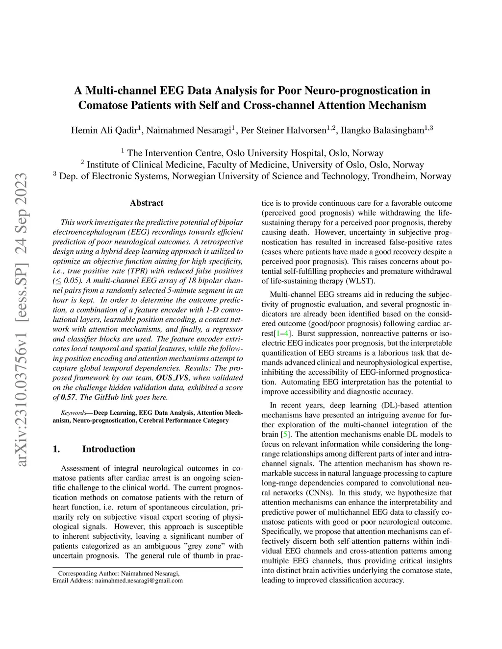 This work investigates the predictive potential of bipolar electroencephalogram (EEG) recordings towards efficient prediction of poor neurological outcomes. A retrospective design using a hybrid deep learning approach is utilized to optimize an objective function aiming for high specificity, i.e., true positive rate (TPR) with reduced false positives (< 0.05). A multi-channel EEG array of 18 bipolar channel pairs from a randomly selected 5-minute segment in an hour is kept. In order to determine the outcome prediction, a combination of a feature encoder with 1-D convolutional layers, learnable position encoding, a context network with attention mechanisms, and finally, a regressor and classifier blocks are used. The feature encoder extricates local temporal and spatial features, while the following position encoding and attention mechanisms attempt to capture global temporal dependencies. Results: The proposed framework by our team, OUS IVS, when validated on the challenge hidden validation data, exhibited a score of 0.57.