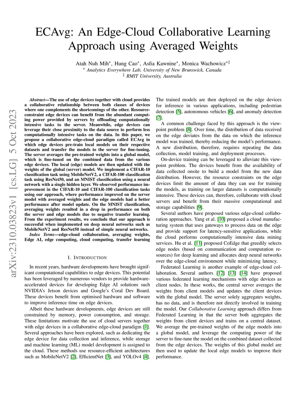 The use of edge devices together with cloud provides a collaborative relationship between both classes of devices where one complements the shortcomings of the other. Resource-constraint edge devices can benefit from the abundant computing power provided by servers by offloading computationally intensive tasks to the server. Meanwhile, edge devices can leverage their close proximity to the data source to perform less computationally intensive tasks on the data. In this paper, we propose a collaborative edge-cloud paradigm called ECAvg in which edge devices pre-train local models on their respective datasets and transfer the models to the server for fine-tuning. The server averages the pre-trained weights into a global model, which is fine-tuned on the combined data from the various edge devices. The local (edge) models are then updated with the weights of the global (server) model. We implement a CIFAR-10 classification task using MobileNetV2, a CIFAR-100 classification task using ResNet50, and an MNIST classification using a neural network with a single hidden layer. We observed performance improvement in the CIFAR-10 and CIFAR-100 classification tasks using our approach, where performance improved on the server model with averaged weights and the edge models had a better performance after model update. On the MNIST classification, averaging weights resulted in a drop in performance on both the server and edge models due to negative transfer learning. From the experiment results, we conclude that our approach is successful when implemented on deep neural networks such as MobileNetV2 and ResNet50 instead of simple neural networks.