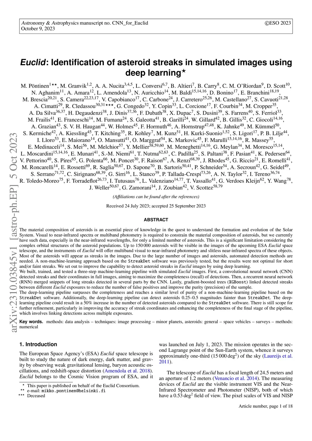 Up to 150000 asteroids will be visible in the images of the ESA Euclid space telescope, and the instruments of Euclid offer multiband visual to near-infrared photometry and slitless spectra of these objects. Most asteroids will appear as streaks in the images. Due to the large number of images and asteroids, automated detection methods are needed. A non-machine-learning approach based on the StreakDet software was previously tested, but the results were not optimal for short and/or faint streaks. We set out to improve the capability to detect asteroid streaks in Euclid images by using deep learning. We built, trained, and tested a three-step machine-learning pipeline with simulated Euclid images. First, a convolutional neural network (CNN) detected streaks and their coordinates in full images, aiming to maximize the completeness (recall) of detections. Then, a recurrent neural network (RNN) merged snippets of long streaks detected in several parts by the CNN. Lastly, gradient-boosted trees (XGBoost) linked detected streaks between different Euclid exposures to reduce the number of false positives and improve the purity (precision) of the sample. The deep-learning pipeline surpasses the completeness and reaches a similar level of purity of a non-machine-learning pipeline based on the StreakDet software. Additionally, the deep-learning pipeline can detect asteroids 0.25-0.5 magnitudes fainter than StreakDet. The deep-learning pipeline could result in a 50% increase in the number of detected asteroids compared to the StreakDet software. There is still scope for further refinement, particularly in improving the accuracy of streak coordinates and enhancing the completeness of the final stage of the pipeline, which involves linking detections across multiple exposures.