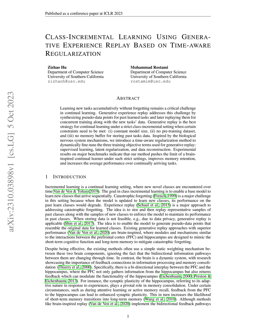 Class-Incremental Learning Using Generative Experience Replay Based on