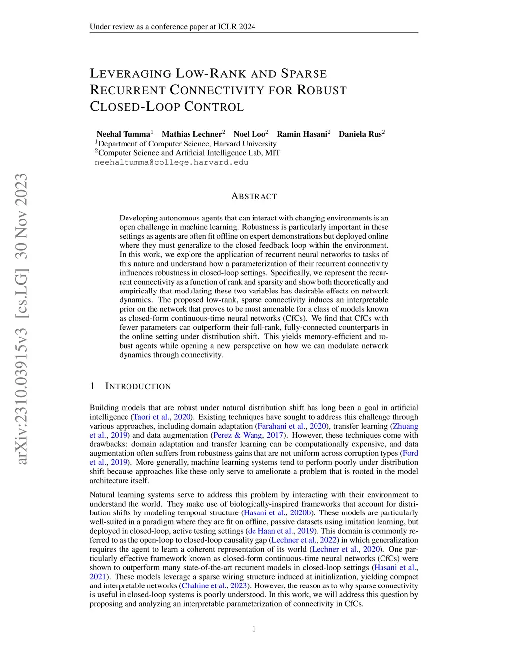Developing autonomous agents that can interact with changing environments is an open challenge in machine learning. Robustness is particularly important in these settings as agents are often fit offline on expert demonstrations but deployed online where they must generalize to the closed feedback loop within the environment. In this work, we explore the application of recurrent neural networks to tasks of this nature and understand how a parameterization of their recurrent connectivity influences robustness in closed-loop settings. Specifically, we represent the recurrent connectivity as a function of rank and sparsity and show both theoretically and empirically that modulating these two variables has desirable effects on network dynamics. The proposed low-rank, sparse connectivity induces an interpretable prior on the network that proves to be most amenable for a class of models known as closed-form continuous-time neural networks (CfCs). We find that CfCs with fewer parameters can outperform their full-rank, fully-connected counterparts in the online setting under distribution shift. This yields memory-efficient and robust agents while opening a new perspective on how we can modulate network dynamics through connectivity.