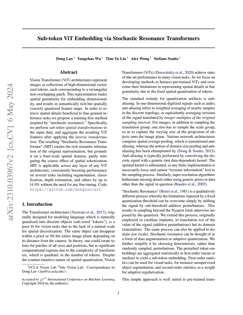 Vision Transformer (ViT) architectures represent images as collections of high-dimensional vectorized tokens, each corresponding to a rectangular non-overlapping patch. This representation trades spatial granularity for embedding dimensionality, and results in semantically rich but spatially coarsely quantized feature maps. In order to retrieve spatial details beneficial to fine-grained inference tasks we propose a training-free method inspired by "stochastic resonance". Specifically, we perform sub-token spatial transformations to the input data, and aggregate the resulting ViT features after applying the inverse transformation. The resulting "Stochastic Resonance Transformer" (SRT) retains the rich semantic information of the original representation, but grounds it on a finer-scale spatial domain, partly mitigating the coarse effect of spatial tokenization. SRT is applicable across any layer of any ViT architecture, consistently boosting performance on several tasks including segmentation, classification, depth estimation, and others by up to 14.9% without the need for any fine-tuning.