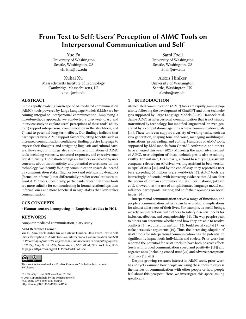 In the rapidly evolving landscape of AI-mediated communication (AIMC), tools powered by Large Language Models (LLMs) are becoming integral to interpersonal communication. Employing a mixed-methods approach, we conducted a one-week diary and interview study to explore users' perceptions of these tools' ability to: 1) support interpersonal communication in the short-term, and 2) lead to potential long-term effects. Our findings indicate that participants view AIMC support favorably, citing benefits such as increased communication confidence, and finding precise language to express their thoughts, navigating linguistic and cultural barriers. However, the study also uncovers current limitations of AIMC tools, including verbosity, unnatural responses, and excessive emotional intensity. These shortcomings are further exacerbated by user concerns about inauthenticity and potential overreliance on the technology. Furthermore, we identified four key communication spaces delineated by communication stakes (high or low) and relationship dynamics (formal or informal) that differentially predict users' attitudes toward AIMC tools. Specifically, participants found the tool is more suitable for communicating in formal relationships than informal ones and more beneficial in high-stakes than low-stakes communication.