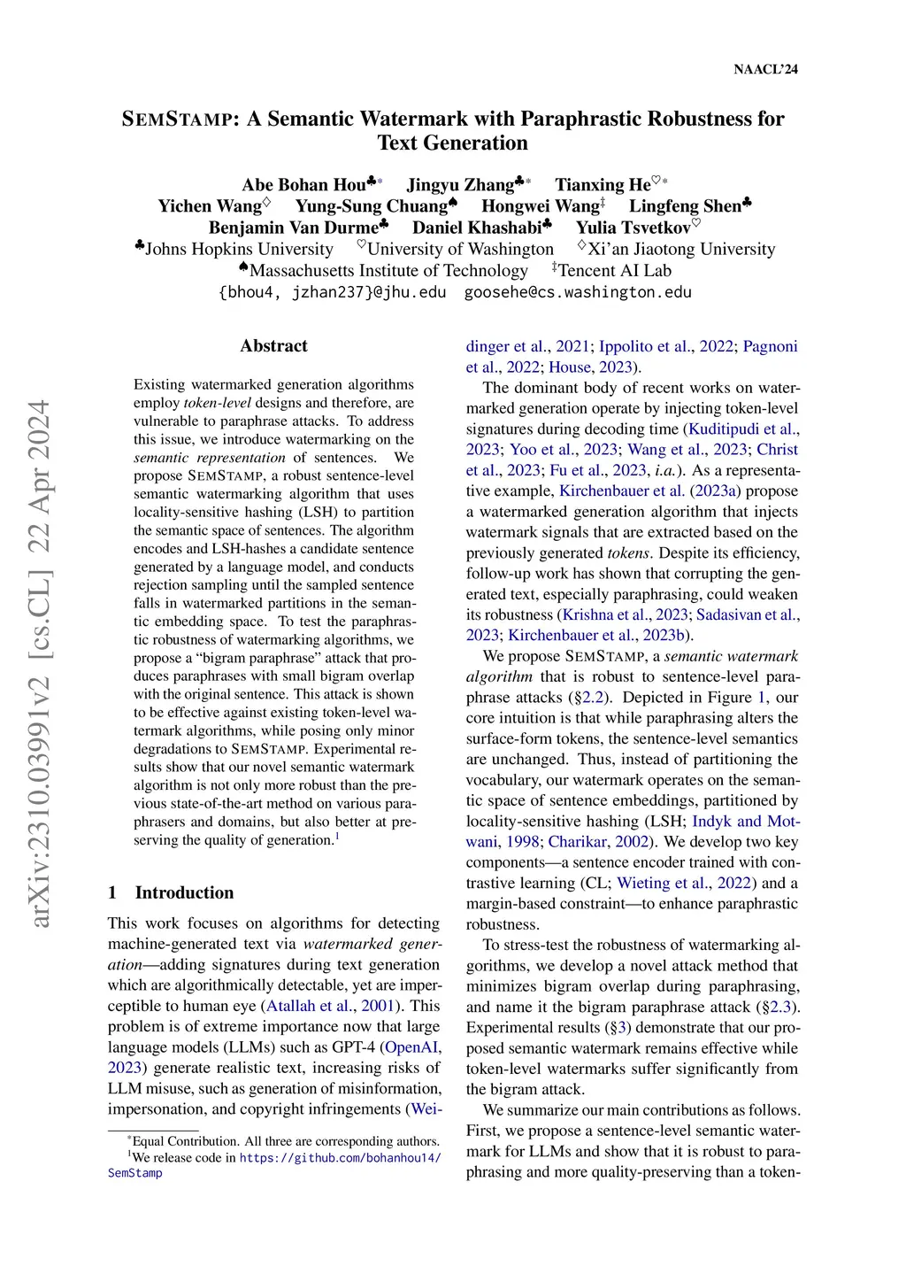 Existing watermarking algorithms are vulnerable to paraphrase attacks because of their token-level design. To address this issue, we propose SemStamp, a robust sentence-level semantic watermarking algorithm based on locality-sensitive hashing (LSH), which partitions the semantic space of sentences. The algorithm encodes and LSH-hashes a candidate sentence generated by an LLM, and conducts sentence-level rejection sampling until the sampled sentence falls in watermarked partitions in the semantic embedding space. A margin-based constraint is used to enhance its robustness. To show the advantages of our algorithm, we propose a "bigram" paraphrase attack using the paraphrase that has the fewest bigram overlaps with the original sentence. This attack is shown to be effective against the existing token-level watermarking method. Experimental results show that our novel semantic watermark algorithm is not only more robust than the previous state-of-the-art method on both common and bigram paraphrase attacks, but also is better at preserving the quality of generation.