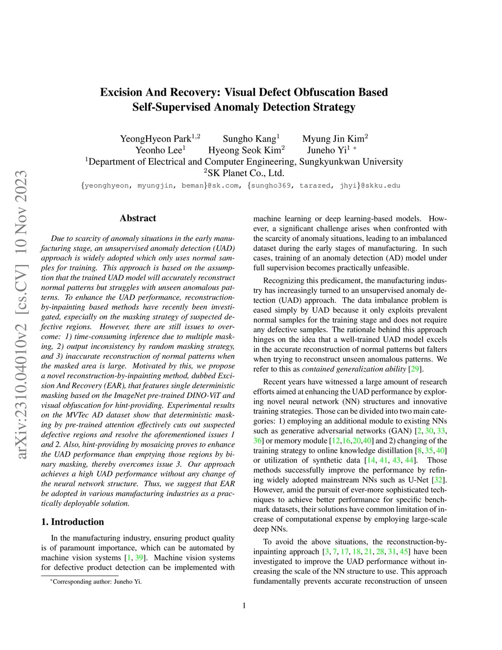 Anomaly detection (AD) in surface inspection is an essential yet challenging task in manufacturing due to the quantity imbalance problem of scarce abnormal data. To overcome the above, a reconstruction encoder-decoder (ED) such as autoencoder or U-Net which is trained with only anomaly-free samples is widely adopted, in the hope that unseen abnormals should yield a larger reconstruction error than normal. Over the past years, researches on self-supervised reconstruction-by-inpainting have been reported. They mask out suspected defective regions for inpainting in order to make them invisible to the reconstruction ED to deliberately cause inaccurate reconstruction for abnormals. However, their limitation is multiple random masking to cover the whole input image due to defective regions not being known in advance. We propose a novel reconstruction-by-inpainting method dubbed Excision and Recovery (EAR) that features single deterministic masking. For this, we exploit a pre-trained spatial attention model to predict potential suspected defective regions that should be masked out. We also employ a variant of U-Net as our ED to further limit the reconstruction ability of the U-Net model for abnormals, in which skip connections of different layers can be selectively disabled. In the training phase, all the skip connections are switched on to fully take the benefits from the U-Net architecture. In contrast, for inferencing, we only keep deeper skip connections with shallower connections off. We validate the effectiveness of EAR using an MNIST pre-trained attention for a commonly used surface AD dataset, KolektorSDD2. The experimental results show that EAR achieves both better AD performance and higher throughput than state-of-the-art methods. We expect that the proposed EAR model can be widely adopted as training and inference strategies for AD purposes.