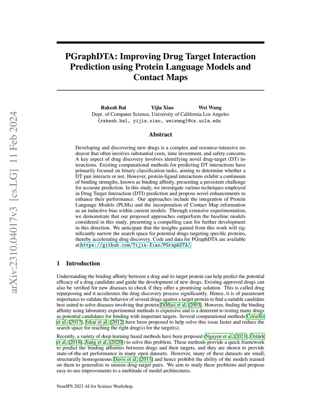 Developing and discovering new drugs is a complex and resource-intensive endeavor that often involves substantial costs, time investment, and safety concerns. A key aspect of drug discovery involves identifying novel drug-target (DT) interactions. Existing computational methods for predicting DT interactions have primarily focused on binary classification tasks, aiming to determine whether a DT pair interacts or not. However, protein-ligand interactions exhibit a continuum of binding strengths, known as binding affinity, presenting a persistent challenge for accurate prediction. In this study, we investigate various techniques employed in Drug Target Interaction (DTI) prediction and propose novel enhancements to enhance their performance. Our approaches include the integration of Protein Language Models (PLMs) and the incorporation of Contact Map information as an inductive bias within current models. Through extensive experimentation, we demonstrate that our proposed approaches outperform the baseline models considered in this study, presenting a compelling case for further development in this direction. We anticipate that the insights gained from this work will significantly narrow the search space for potential drugs targeting specific proteins, thereby accelerating drug discovery. Code and data for PGraphDTA are available at https://github.com/Yijia-Xiao/PgraphDTA/.
