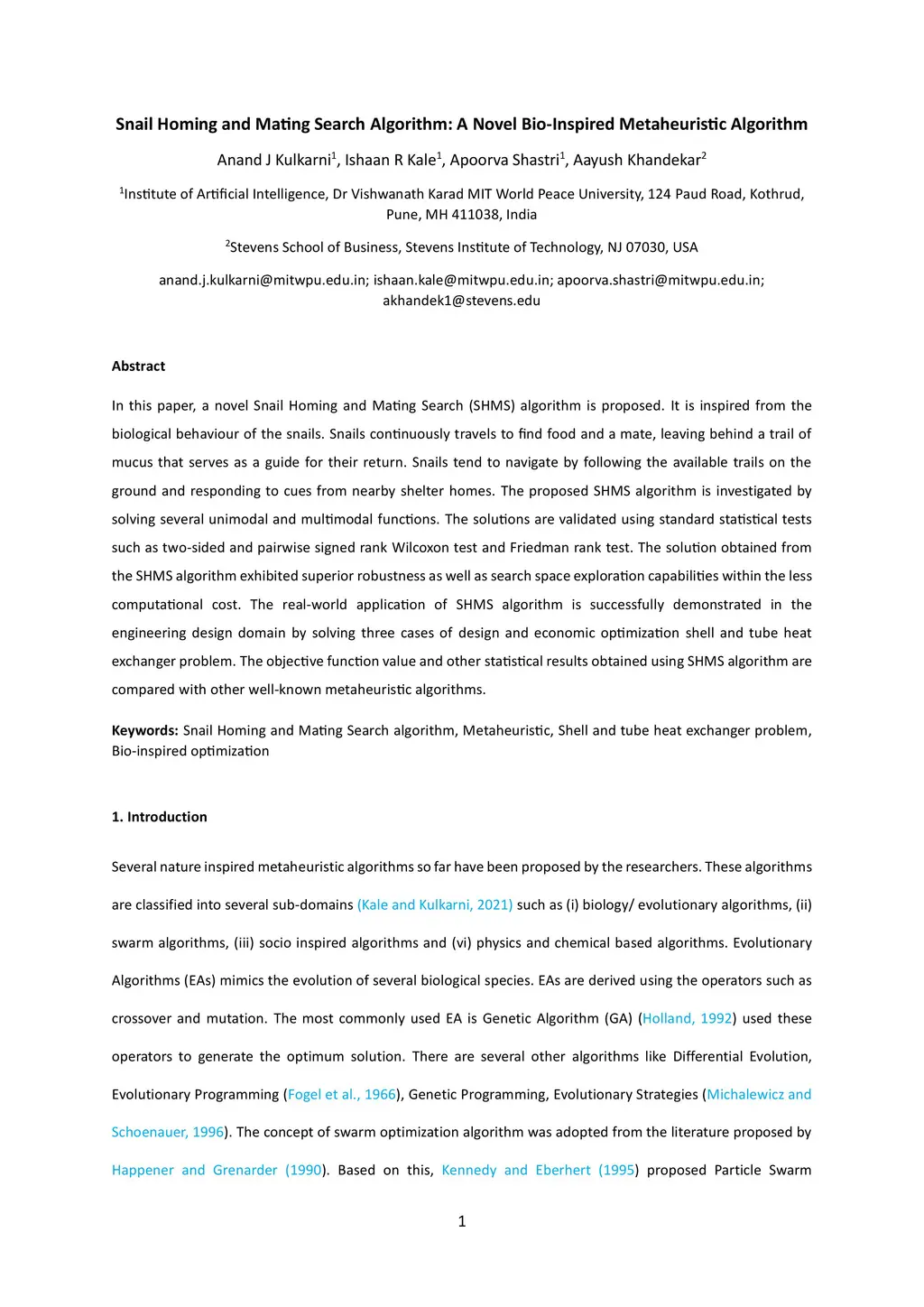 In this paper, a novel Snail Homing and Mating Search (SHMS) algorithm is proposed. It is inspired from the biological behaviour of the snails. Snails continuously travels to find food and a mate, leaving behind a trail of mucus that serves as a guide for their return. Snails tend to navigate by following the available trails on the ground and responding to cues from nearby shelter homes. The proposed SHMS algorithm is investigated by solving several unimodal and multimodal functions. The solutions are validated using standard statistical tests such as two-sided and pairwise signed rank Wilcoxon test and Friedman rank test. The solution obtained from the SHMS algorithm exhibited superior robustness as well as search space exploration capabilities within the less computational cost. The real-world application of SHMS algorithm is successfully demonstrated in the engineering design domain by solving three cases of design and economic optimization shell and tube heat exchanger problem. The objective function value and other statistical results obtained using SHMS algorithm are compared with other well-known metaheuristic algorithms.