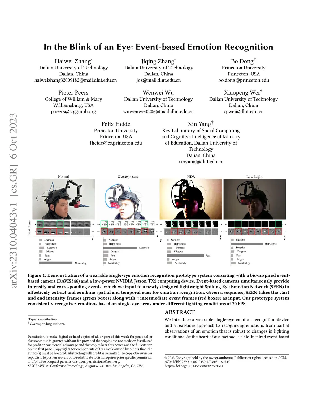 We introduce a wearable single-eye emotion recognition device and a real-time approach to recognizing emotions from partial observations of an emotion that is robust to changes in lighting conditions. At the heart of our method is a bio-inspired event-based camera setup and a newly designed lightweight Spiking Eye Emotion Network (SEEN). Compared to conventional cameras, event-based cameras offer a higher dynamic range (up to 140 dB vs. 80 dB) and a higher temporal resolution. Thus, the captured events can encode rich temporal cues under challenging lighting conditions. However, these events lack texture information, posing problems in decoding temporal information effectively. SEEN tackles this issue from two different perspectives. First, we adopt convolutional spiking layers to take advantage of the spiking neural network's ability to decode pertinent temporal information. Second, SEEN learns to extract essential spatial cues from corresponding intensity frames and leverages a novel weight-copy scheme to convey spatial attention to the convolutional spiking layers during training and inference. We extensively validate and demonstrate the effectiveness of our approach on a specially collected Single-eye Event-based Emotion (SEE) dataset. To the best of our knowledge, our method is the first eye-based emotion recognition method that leverages event-based cameras and spiking neural network.